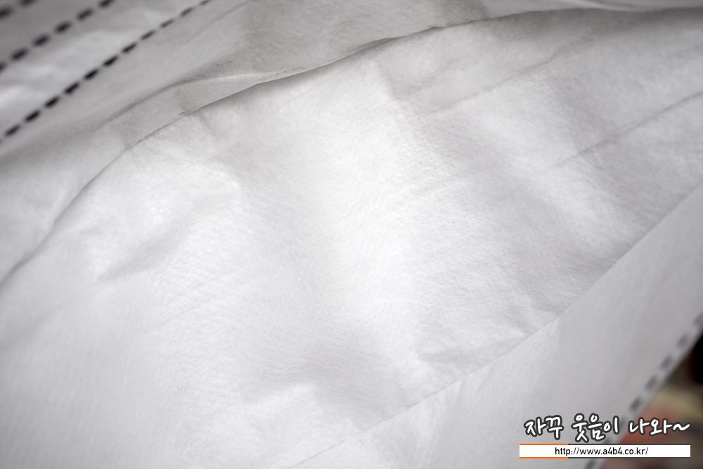 KF94 숨코 마스크 대형+ 내피는 부드러운 감촉의 부직포가 적용되었습니다. 내피에 보풀이나 약품 냄새는 없고, 장시간 착용해도 가렵거나 간지러운 피부 틀러블도 없습니다. 마스크 원자재의 생산국가는 확인 못했네요.