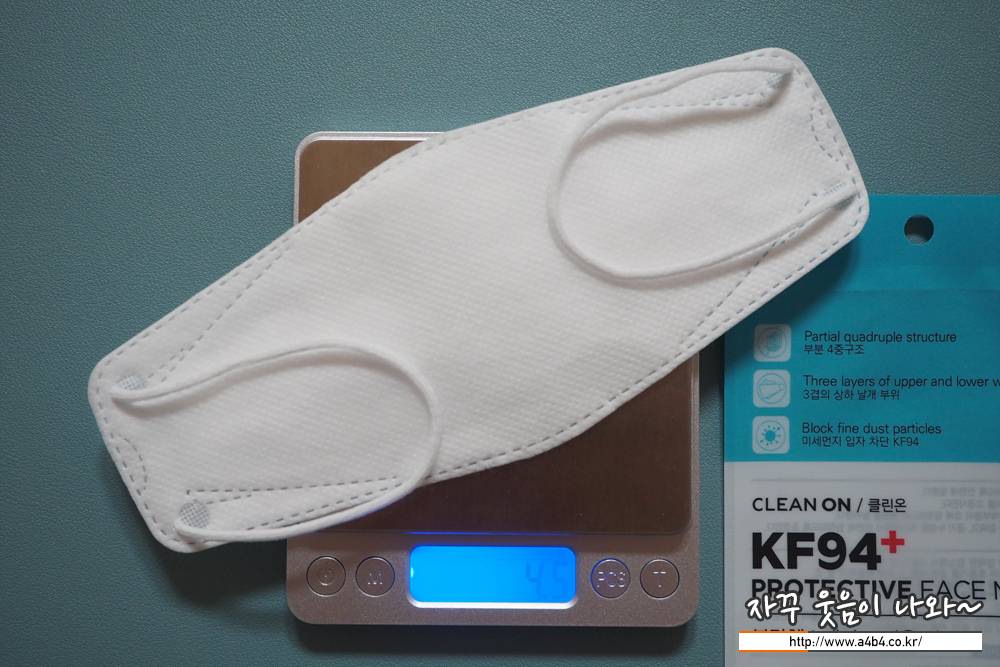 블랑헬스케어 마스크 대형 중량은 4.5g으로 KF94 대형 사이즈 마스크와 비슷한 중량입니다.
