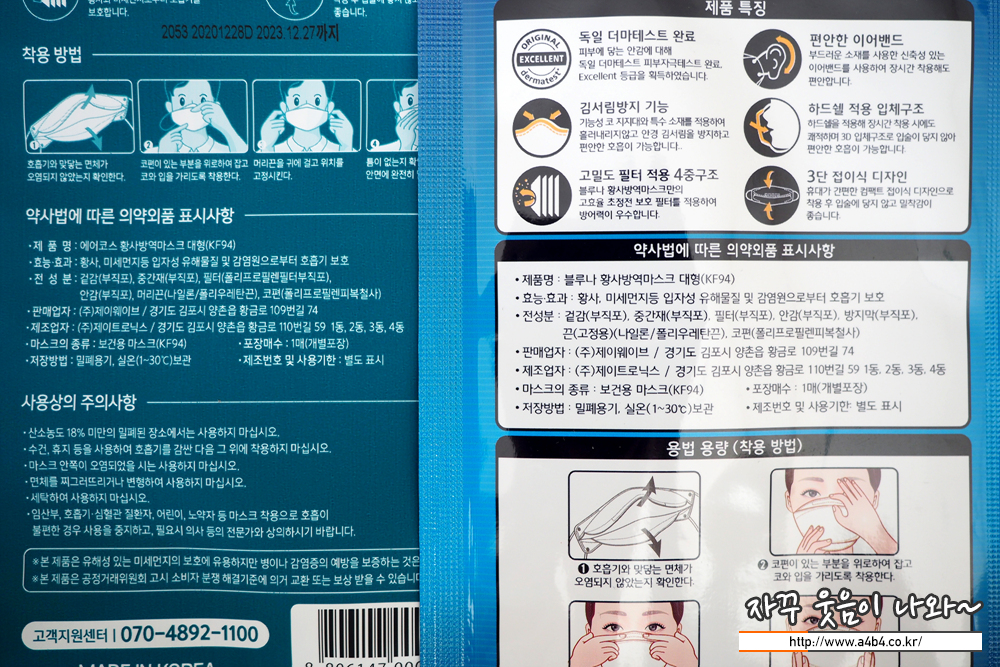 식품의약품안전처 의약품안전나라 등록 제품명은 '에어코스 황사방역마스크 대형'입니다. 대형사이즈 KF94 제품으로 작년 1월에 승인된 마스크입니다. 주목할점은 바로 마스크 제조사가 '제이트로닉스'입니다. 한 때 마스크계의 루이비통으로 불리던 끈저절 마스크인 블루나 페이스핏으로 알려진 곳입니다.