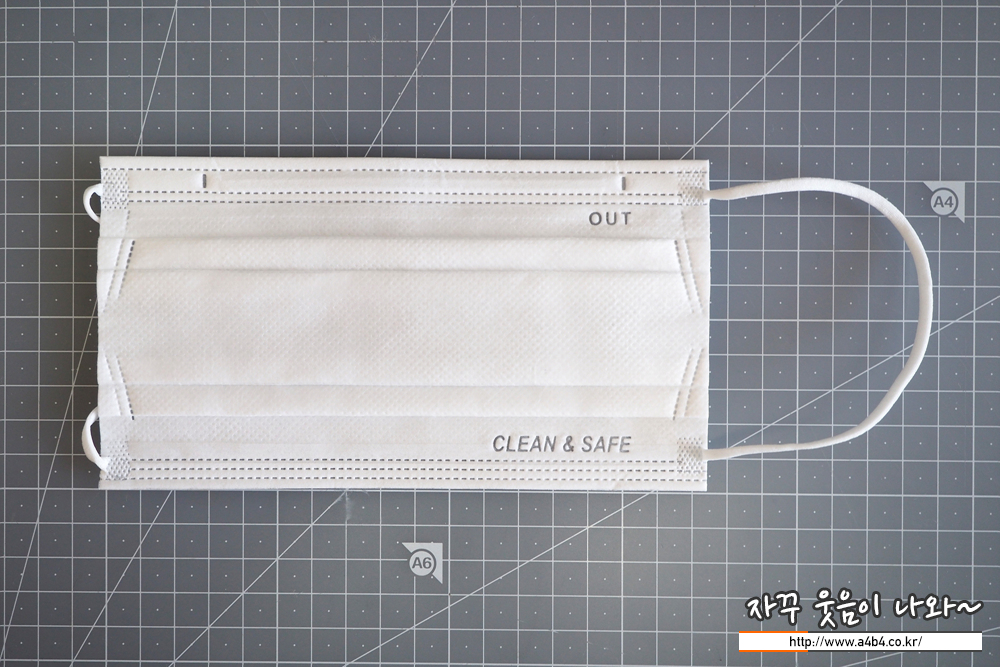 마스크 하단에는 클린 & 세이프 문구가 영문으로 표시되어 있으며 마스크 앞면을 표시하는 OUT 문구가 있습니다.