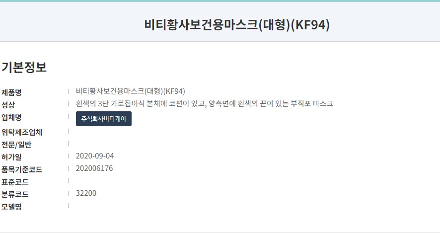 식품의약품안전처 의약품안전나라 등록명칭은 '비티황사보건용마스크'로 KF94, 대형입니다. 작년 9월 승인된 제품으로 마스크 제조원은 '(주)비티케이'입니다. '비티' 상표의 마스크를 주로 생산하고 있습니다.
