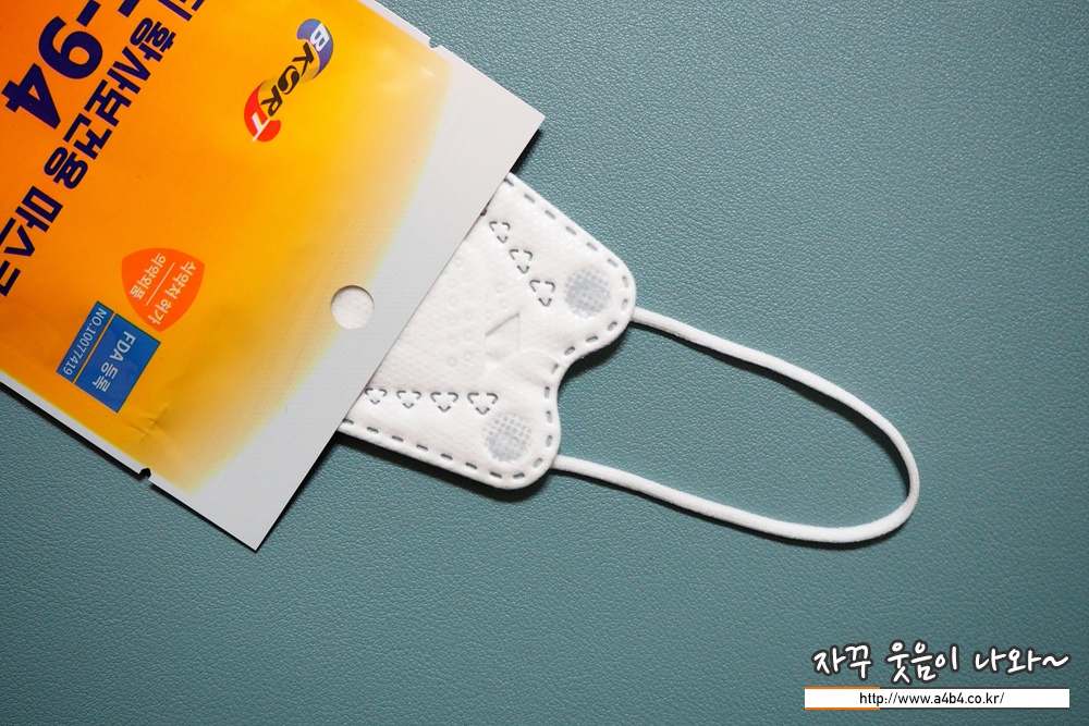 둥근모양의 귀걸이끈은 마스크 전면에 접착되어 있으며, 귀걸이끈 탄력은 조금 짱짱한 편입니다.
