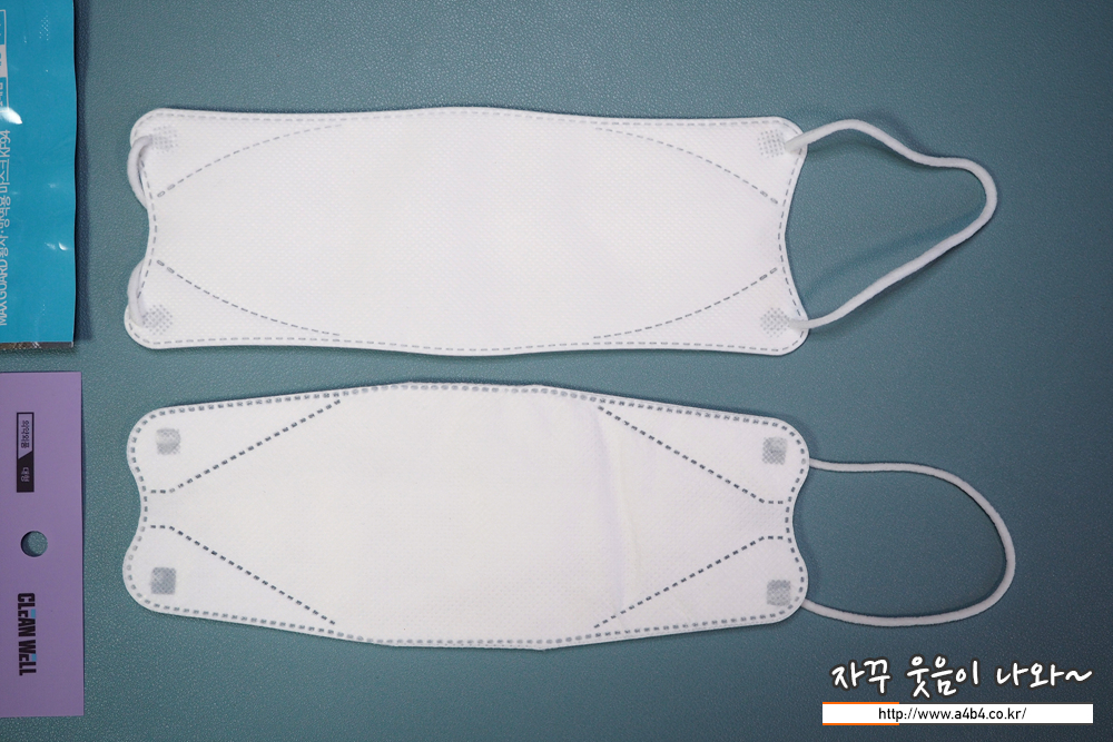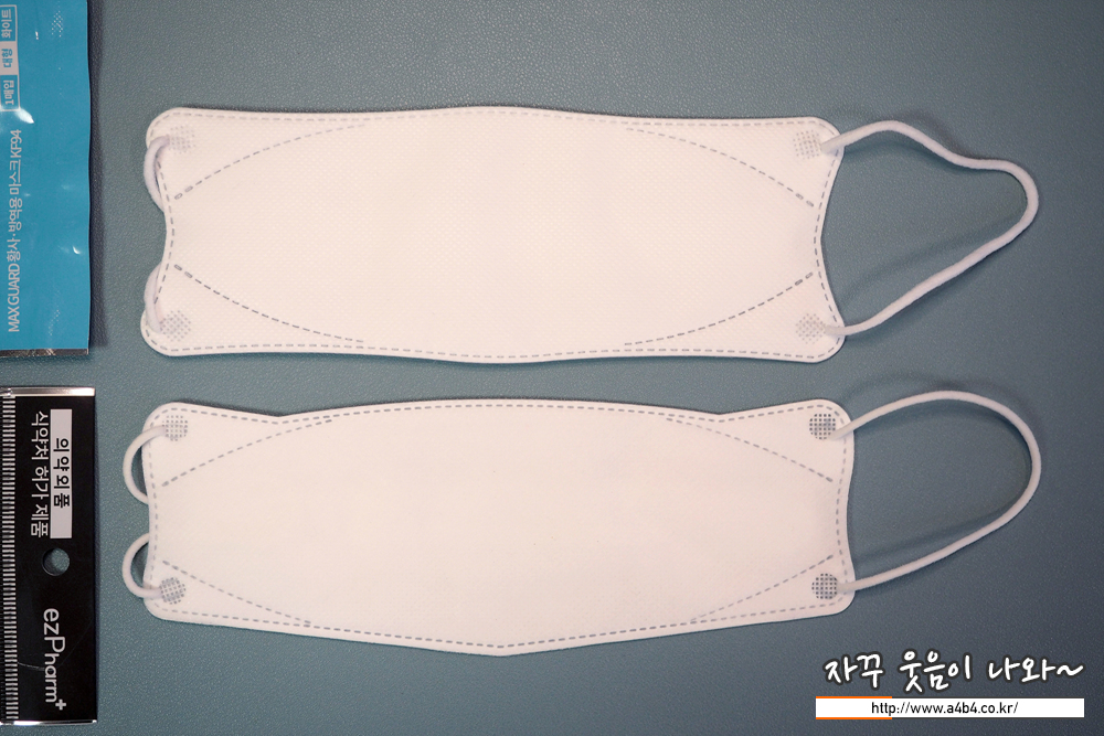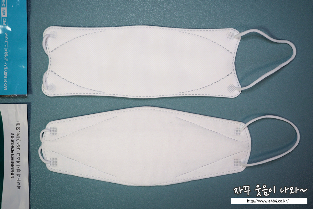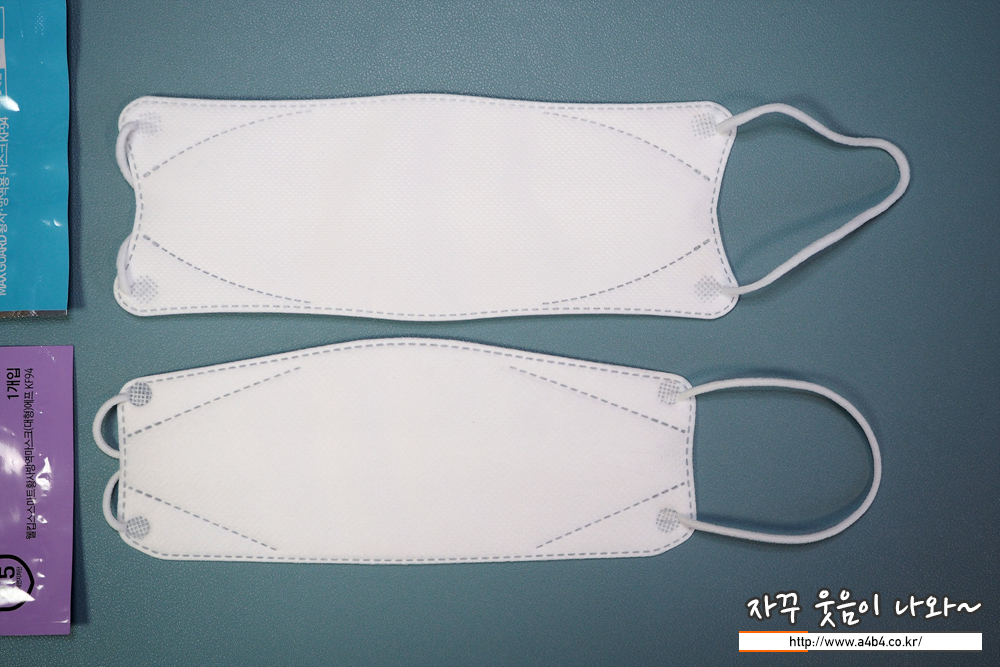 맥스가드 마스크 디자인은 가로 삼단접이식 3D타입의 마스크입니다. 사각에 가까운 양쪽 귀걸이끈 부분이 삐침처리된 조금은 개성있는 디자인의 제품입니다. 우선은 이어밴드 사이 높이가 여유 있어서 저에게는 잘 맞을 것 같은데요...