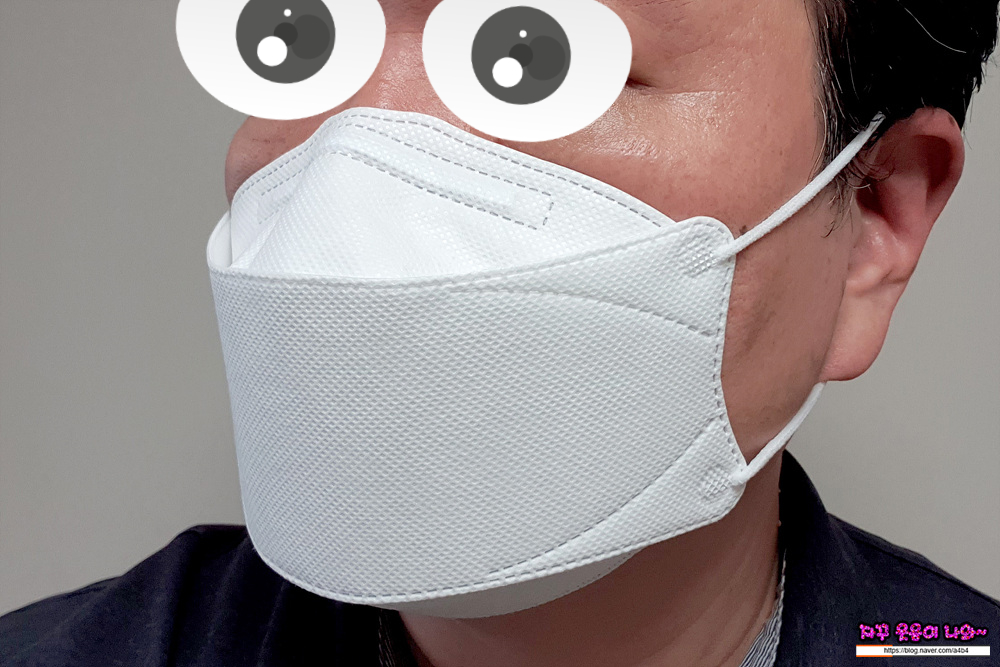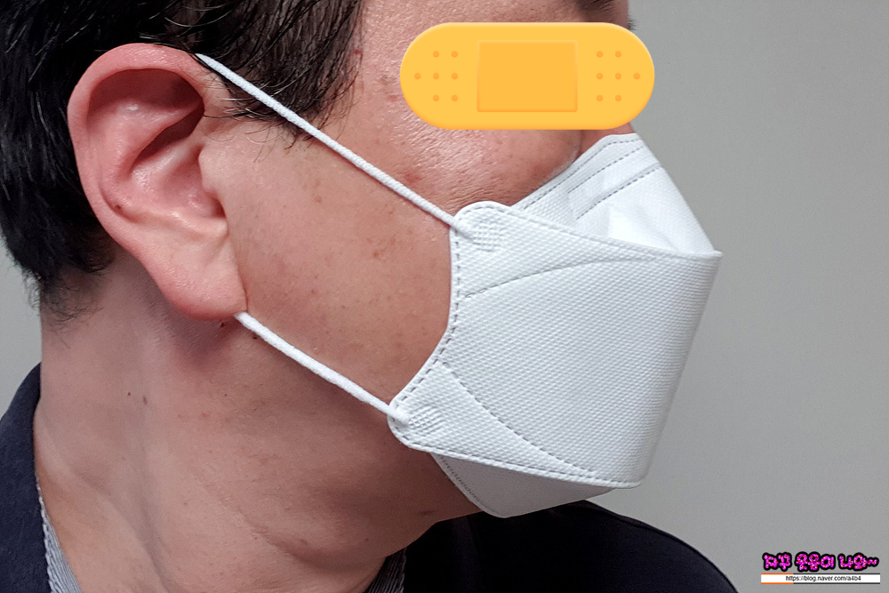 KF94 맥스가드 마스크 대형은 일반 대형크기의 마스크에 비해 조금 여유있는 사이즈를 보여줍니다. 위 사진에서 보듯 귀가 당기지 않네요. 착용감도 얼굴 눌림도 강하지 않습니다.