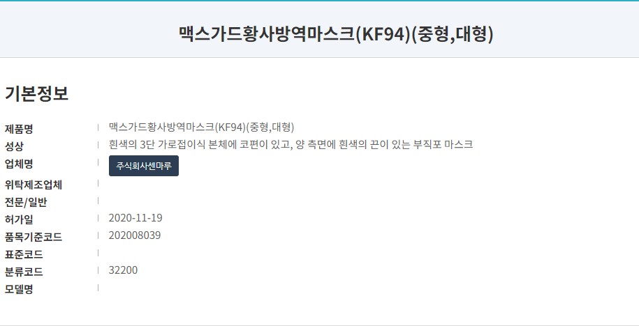 식품의약품안전처 의약품안전나라 등록 제품명은 '맥스가드황사방역마스크(KF94)'로 작년 11월 승인된 제품입니다. 마스크 제조사는 '주식회사센마루'입니다.
