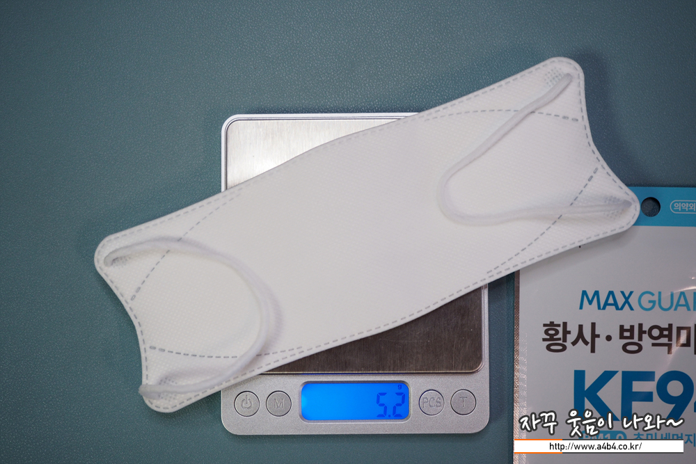 KF94 맥스가드 마스크 대형 중량은 5.2그램으로 대형사이즈 마스크 중에서는 약간 중량이 있습니다.