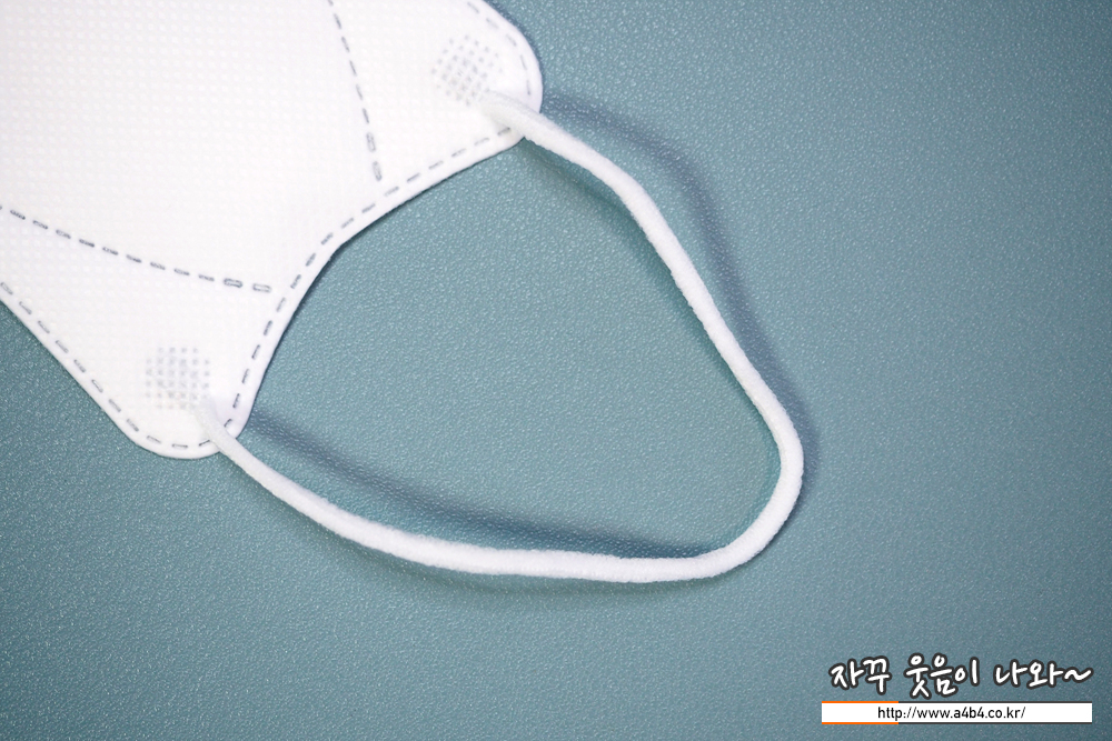 둥근 모양의 이어밴드는 마스크 전면에 접착되어 있으며, 접착 상태는 양호합니다. 이어밴드 탈력은 보통수준입니다.