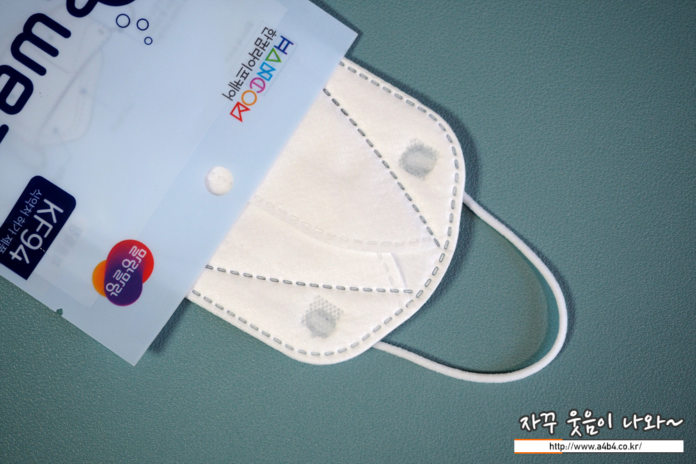 둥근 디자인의 한컴 마스크 귀걸이끈은 마스크 앞부분에 접착되어 있으며, 귀걸이끈 탄력은 조금 쎄네요.