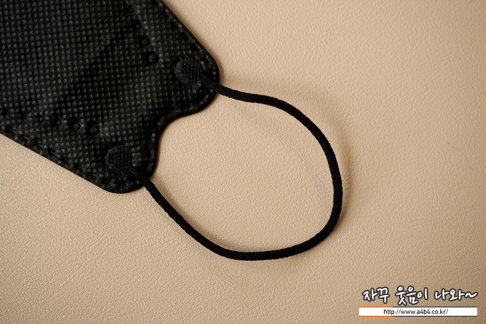 원형의 귀걸이끈은 마스크 앞면에 접착되어 있으며, 접착 품질은 양호합네요. 귀걸이끈 탄력은 보통수준입니다.