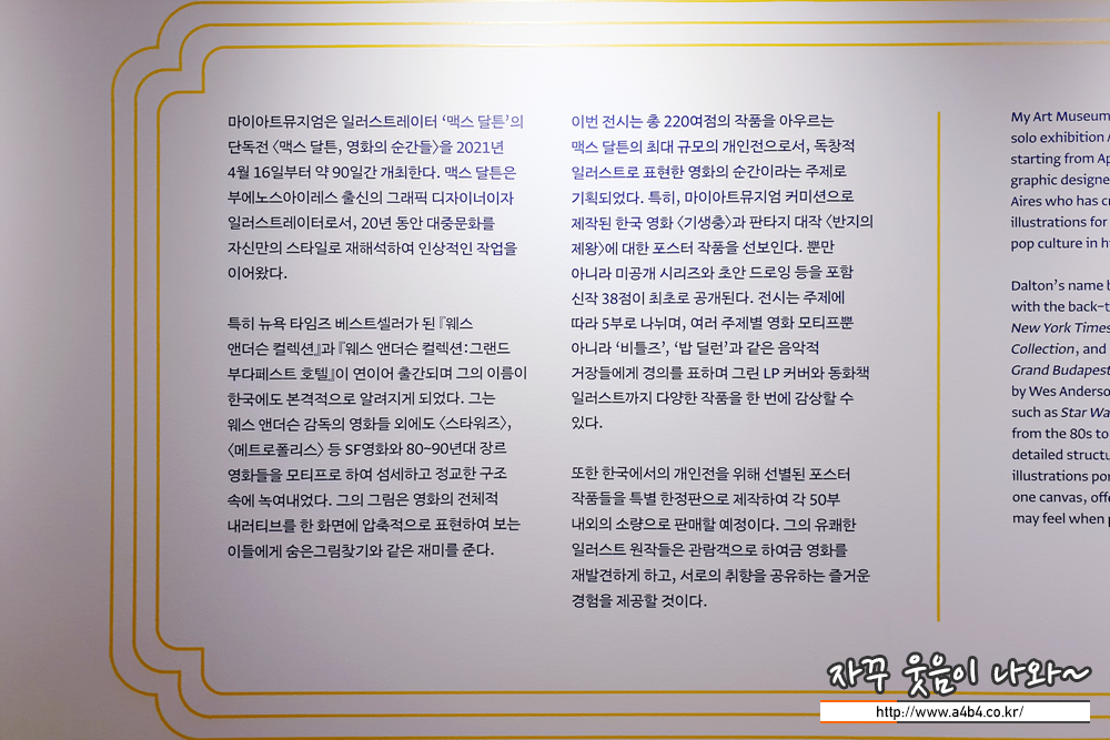 이번 전시는 세계적인 일러스트레이터인 맥스 달튼의 영화와 음악을 소재로 그가 작업한 작품들을 만나볼 수 있는 기회입니다. 특히 알폰스 무하전과 마티즈전, 빅아이 전시회 등을 통해 기획력을 인정받은 마이아트 뮤지엄에서 준비한 전시로 거의 믿고 보는 전시회라고 할까요. (저는 얼리버드 티켓 예약으로 50% 할인을...)