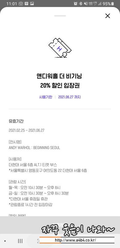 아래와 같이 현대백화점 그름 H Point 앱을 설치하고 회원 가입하면 '앤디워홀 더 비기닝 20% 할인 입장권'을 받을 수 있습니다. 해당 앱을 매표소에서 보여주시면 확인 후 할인이 가능합니다.