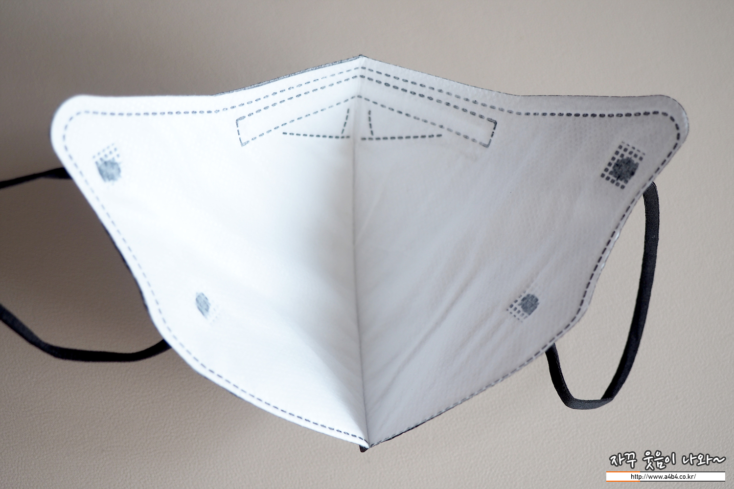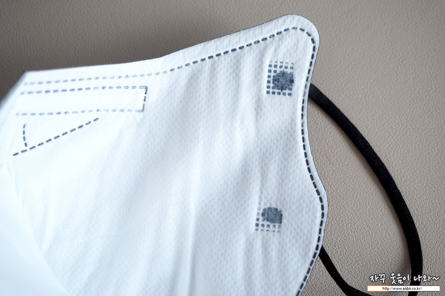 칼국수끈으로 불리는 납작한 디자인의 귀걸이끈이 마스크 전면에 접착되어 있으며, 귀걸이끈 탄성은 조금 강한 타입입니다.