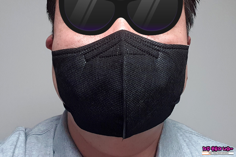 참존 마스크 블랙은 KF94 타입의 제품으로 두께감이 있는 부리형 제품입니다. 조금 소프트한 스타일로 착용감과 착용핏도 동일합니다. 전체적으로 무난한 착용감을 보이며, 마스크 발색은 반사가 강한 유광블랙 스타일의 제품입니다.