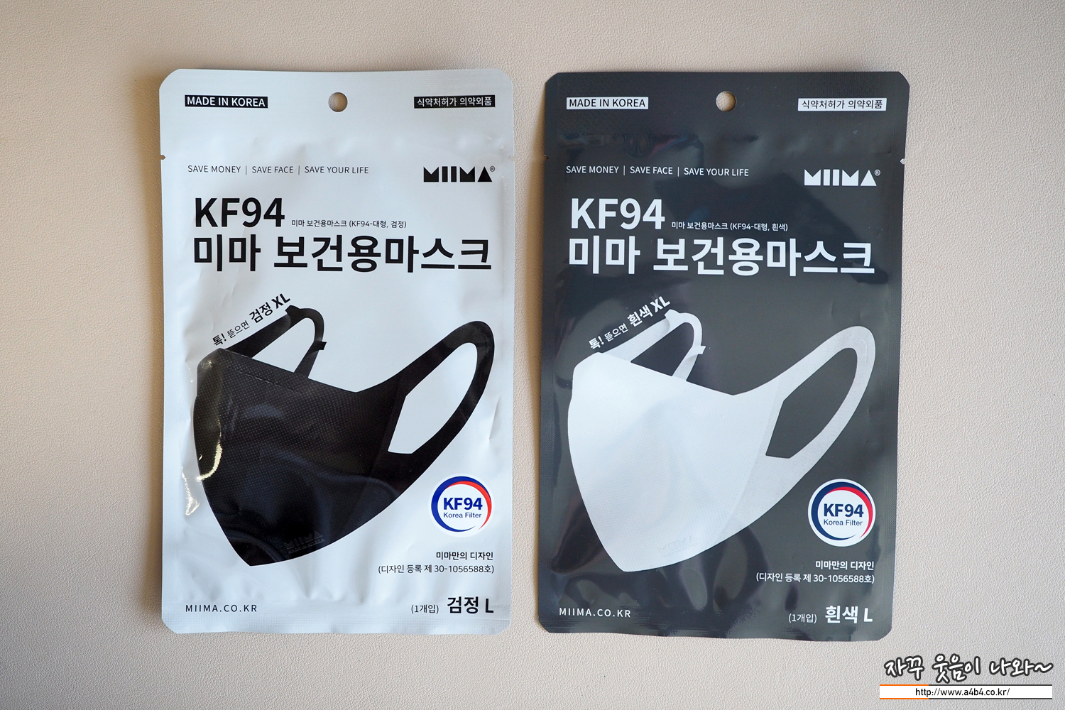 동일한 라인 다른 색상 같은 사이즈와 착용감을 보이는 미마 보건용 마스크 KF94 흰색 대형과 비교