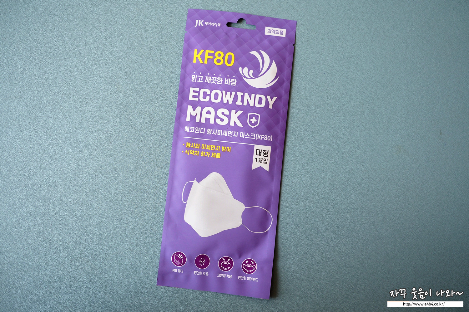 식약처 등록 제품명은 '에코윈디황사미세먼지마스크(KF80)'입니다. 대형 크기로 작년 8월 승인된 마스크로 마스크 제조사는 '(주)제이케이텍'으로 에코윈디 KF94 마스크, KF-AD 마스크 등을 생산하는 곳입니다.