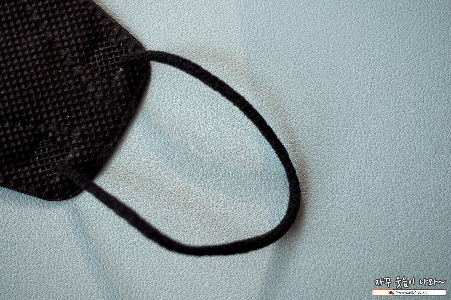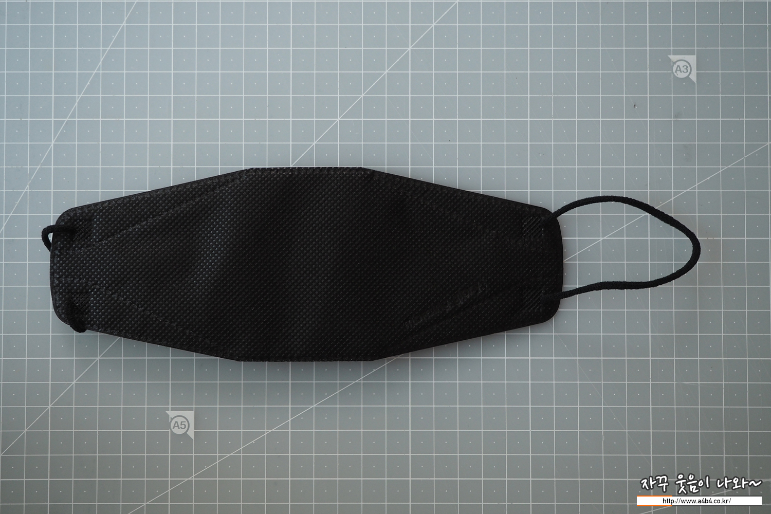 마스크 겉감은 패턴 처리된 매끄러운 감촉의 검정 부직포가 사용되었습니다. 4중 필터구조로 마스크 두께는 일반적인 수준이며 하드한 착용감을 보여줍니다. 블랙 색상의 발색은 반유광 블랙 스타일로 얼룩이나 지저분한 마감 없이 깔끔한 색상을 보입니다.