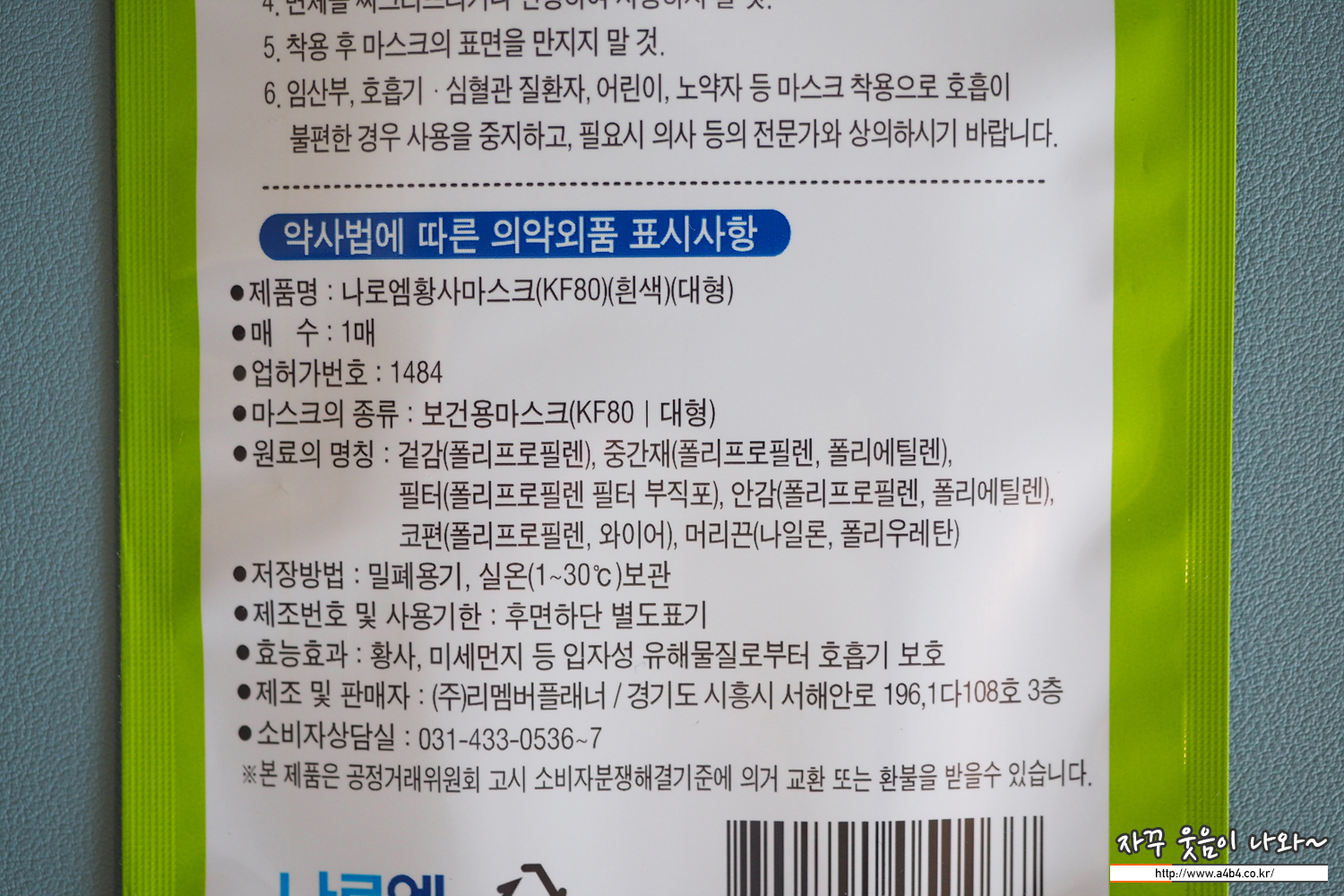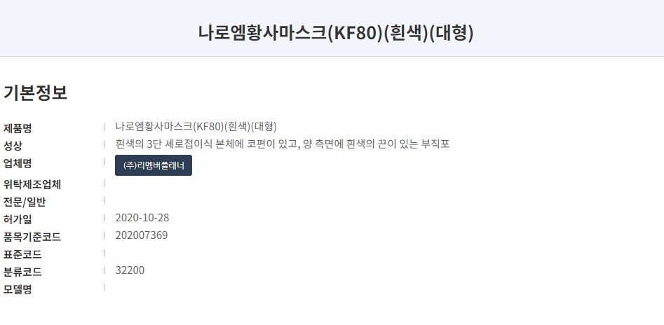 식약처 등록 제품명은 '나로엠황사마스크(KF80)'로 흰색 색상 대형사이즈 제품입니다. 작년 10월 허가된 제품으로 마스크 제조사는 (주)리멤버플래너 입니다. 이외에도 '나로엠' 브랜드로 KF94, KF-AD 대형 사이즈 마스크를 생산하고 있습니다.