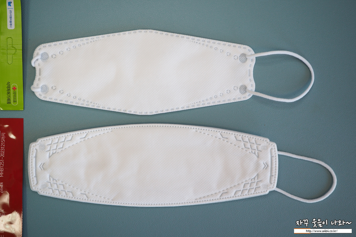 마스크 디자인은 삼단접이식 3D 스타일의 제품으로 일반적인 타입의 디자인을 보입니다. 부직포 접합 부분의 디자인이 물방울형 모양으로 처리되어 있는 조금 독특한 제품입니다.