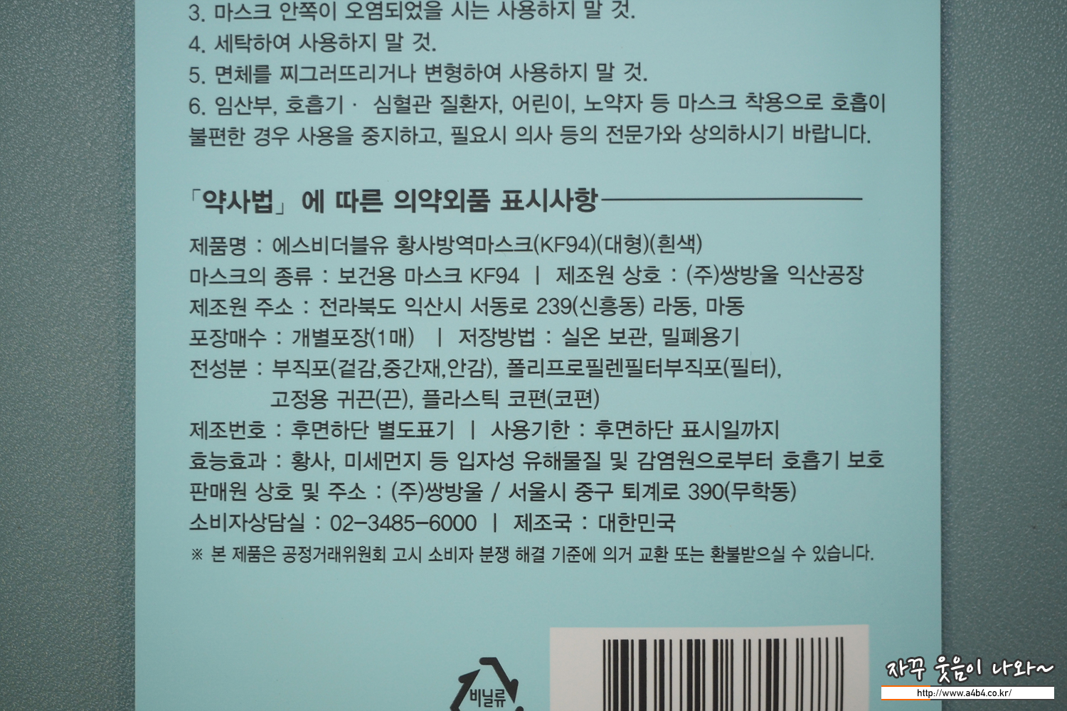 식약처 등록 명칭은 '뉴 에스비더블유 황사방역마스크 (KF94)' 입니다. SBW는 아마 쌍빵울 이니셜이 아닐까 하네요. 오늘은 대형, 흰색 제품으로 리뷰 진행합니다. 올해 6월 식약처 등록된 제품으로 마스크 제조원은 '(주)쌍방울 익산공장'입니다. 쌍방울에서는 그룹 차원에서 마스크 사업에 많은 투자를 하고 있다고 들었네요.