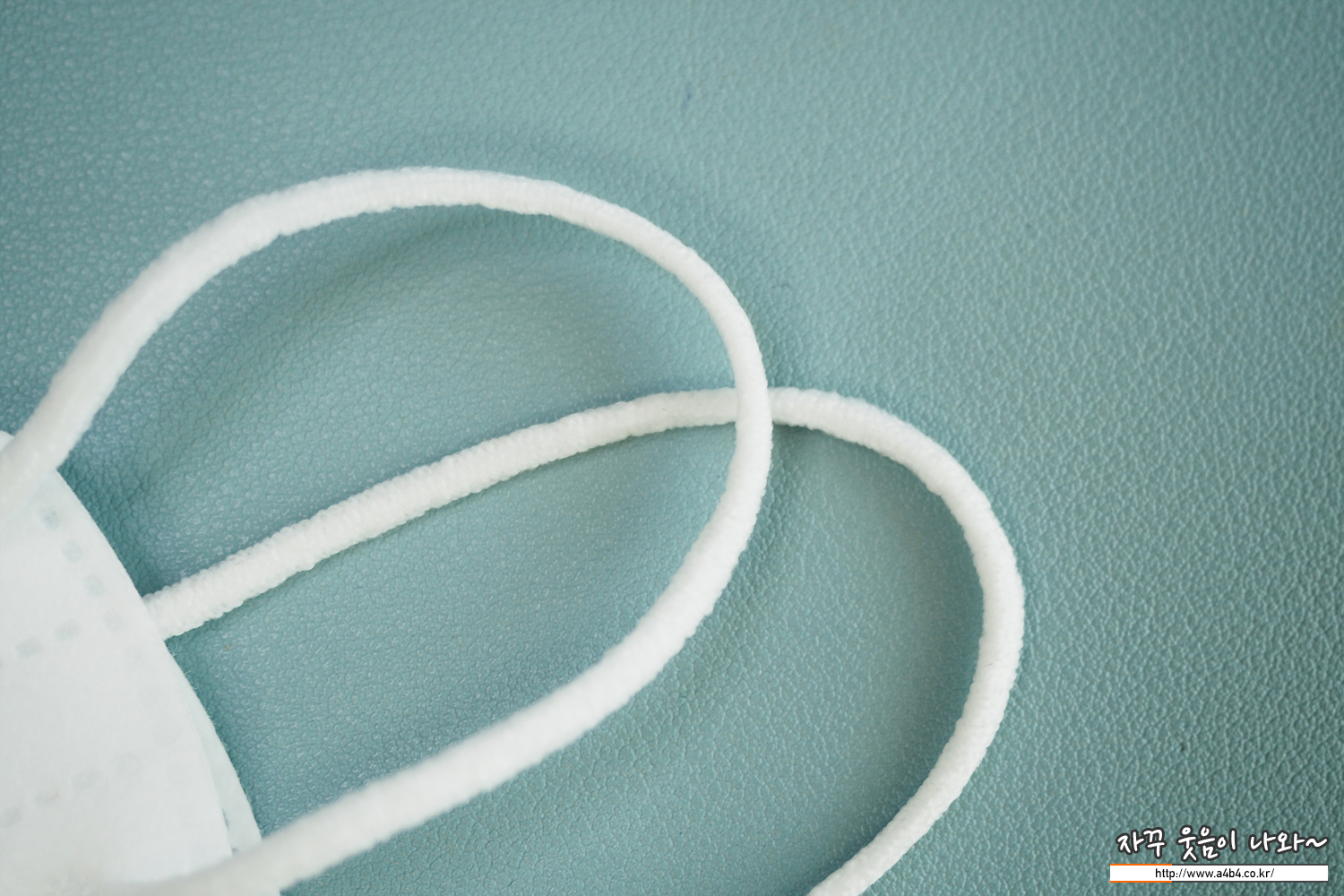마스크 앞부분에는 둥근 모양의 이어밴드가 접착되어 있으며, 후크가 포함된 마스크입니다. 이어밴드 탄력은 약간 약한 타입이며, 두께는 조금 두툼한 제품입니다.