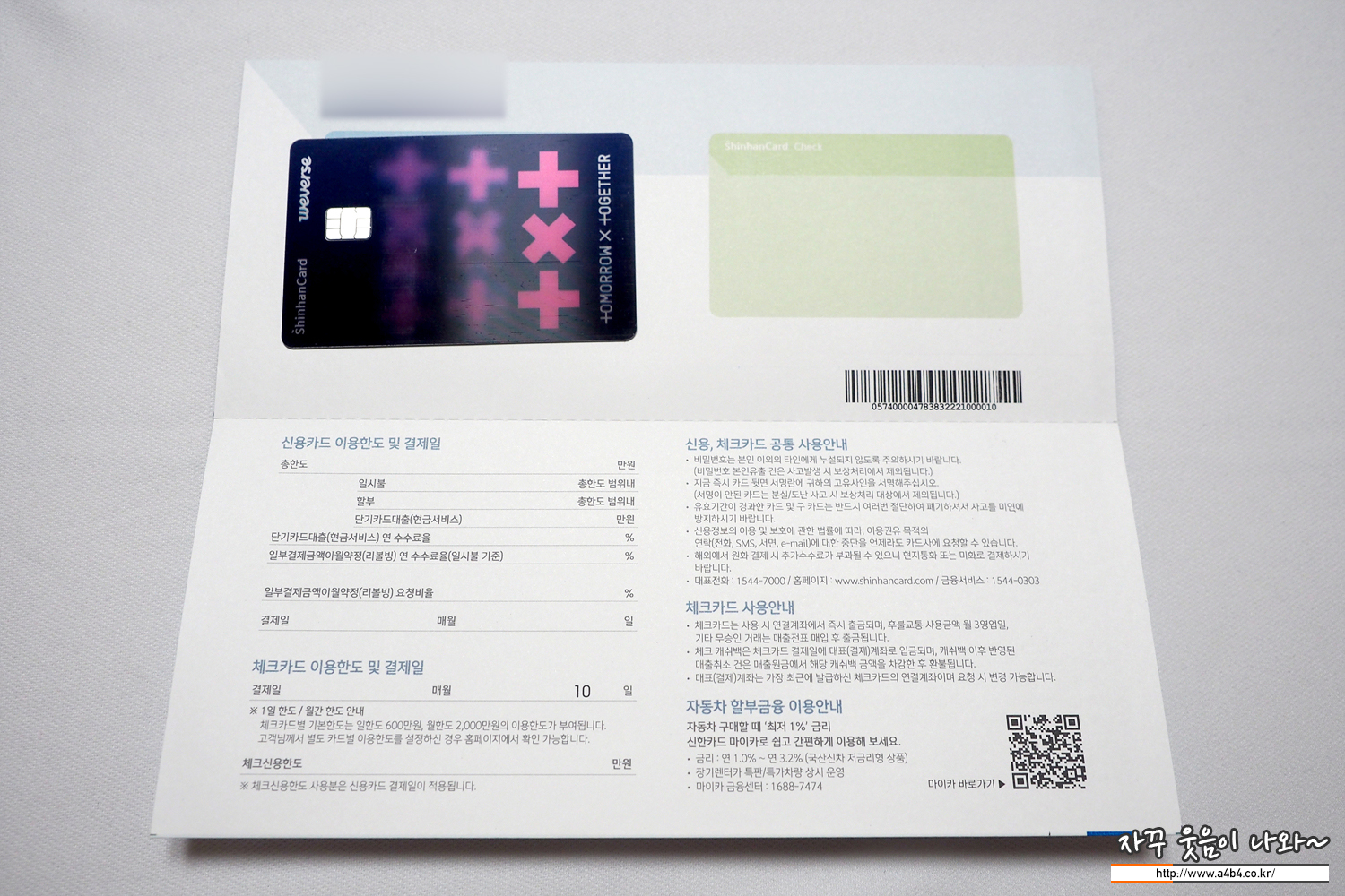 딸아이가 좋아하는 투모로우바이투게더 체크카드를 신청했습니다. 일반적인 체크카드와 다르게 상당히 고급진 디자인을 보여줍니다.