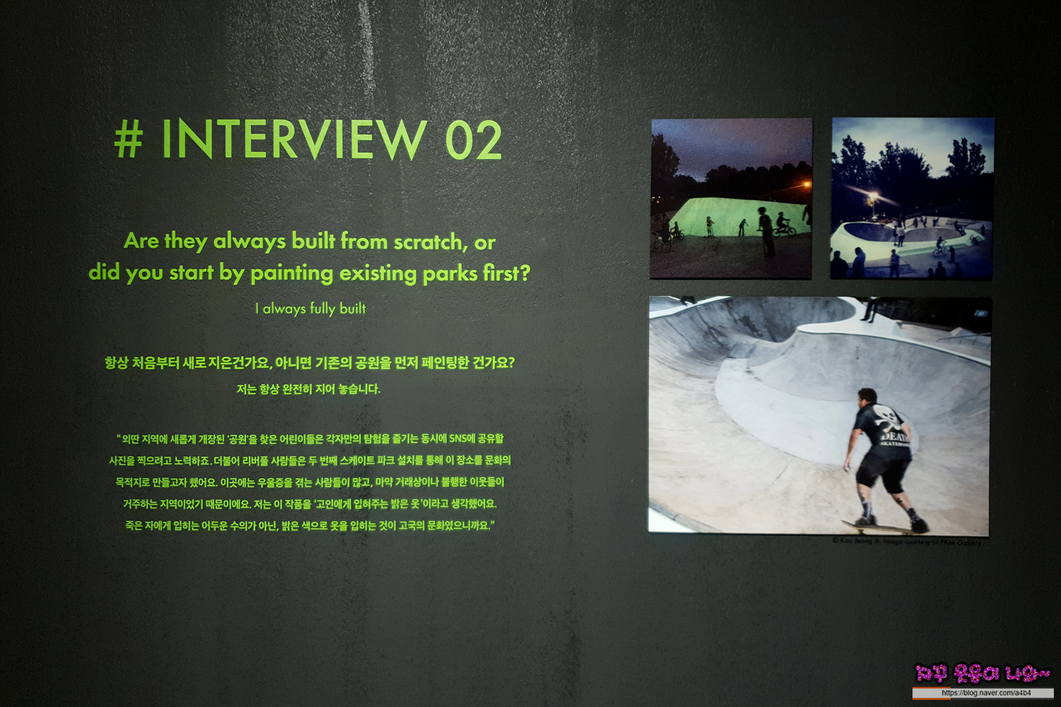 마지막 다섯번째 작품은 지난달에 오픈한 롯데프리미엄아울렛에 설치된 스케이트 파크에 대한 모형과 사진이 전시된 공간입니다. 지금은 교통지옥이라고 하는데 조금 잠잠해지면 보드 가지고 가보려고 합니다.