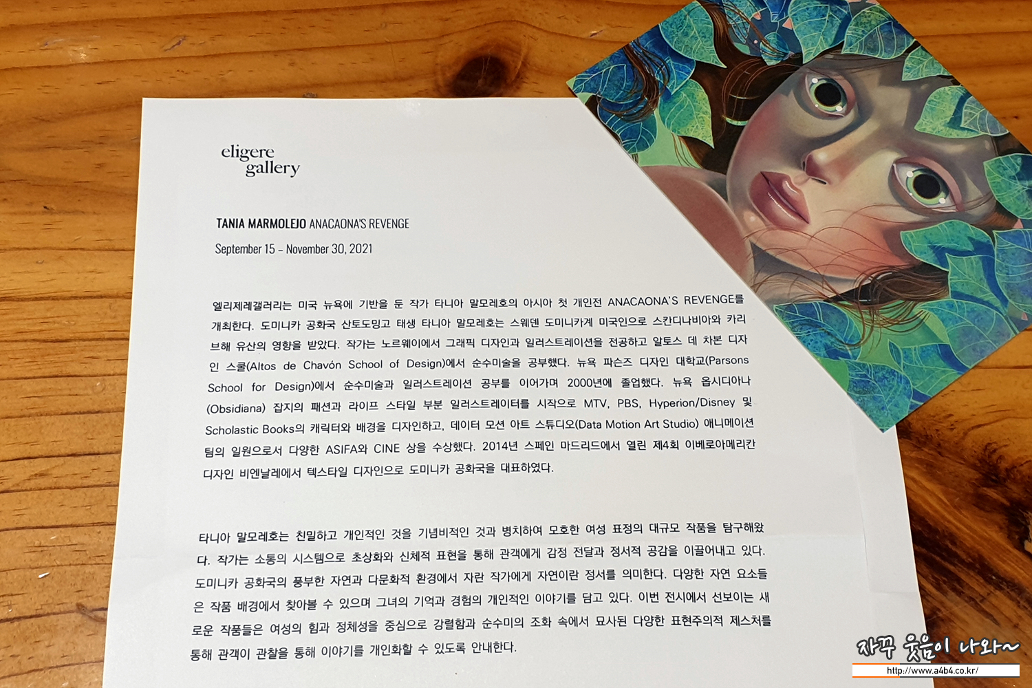 장소는 강남구 청담동에 위치한 엘리제레 갤러리(eligere gallery)에서 열리고 있으며, 매주 화요일부터~금요일까지 다음달 말일인 11월 30일까지 전시회가 진행됩니다.