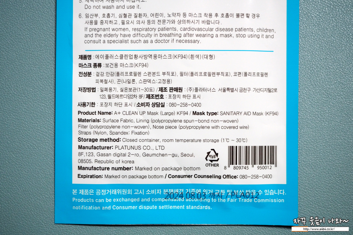 식약처 등록 제품명칭은 '에이플러스 클린업 황사방역용마스크 KF94'입니다. 흰색의 대형사이즈 마스크로 마스크 제조원은 '주식회사 플라터너스'입니다. 작년인 20년 9월 승인된 제품입니다.