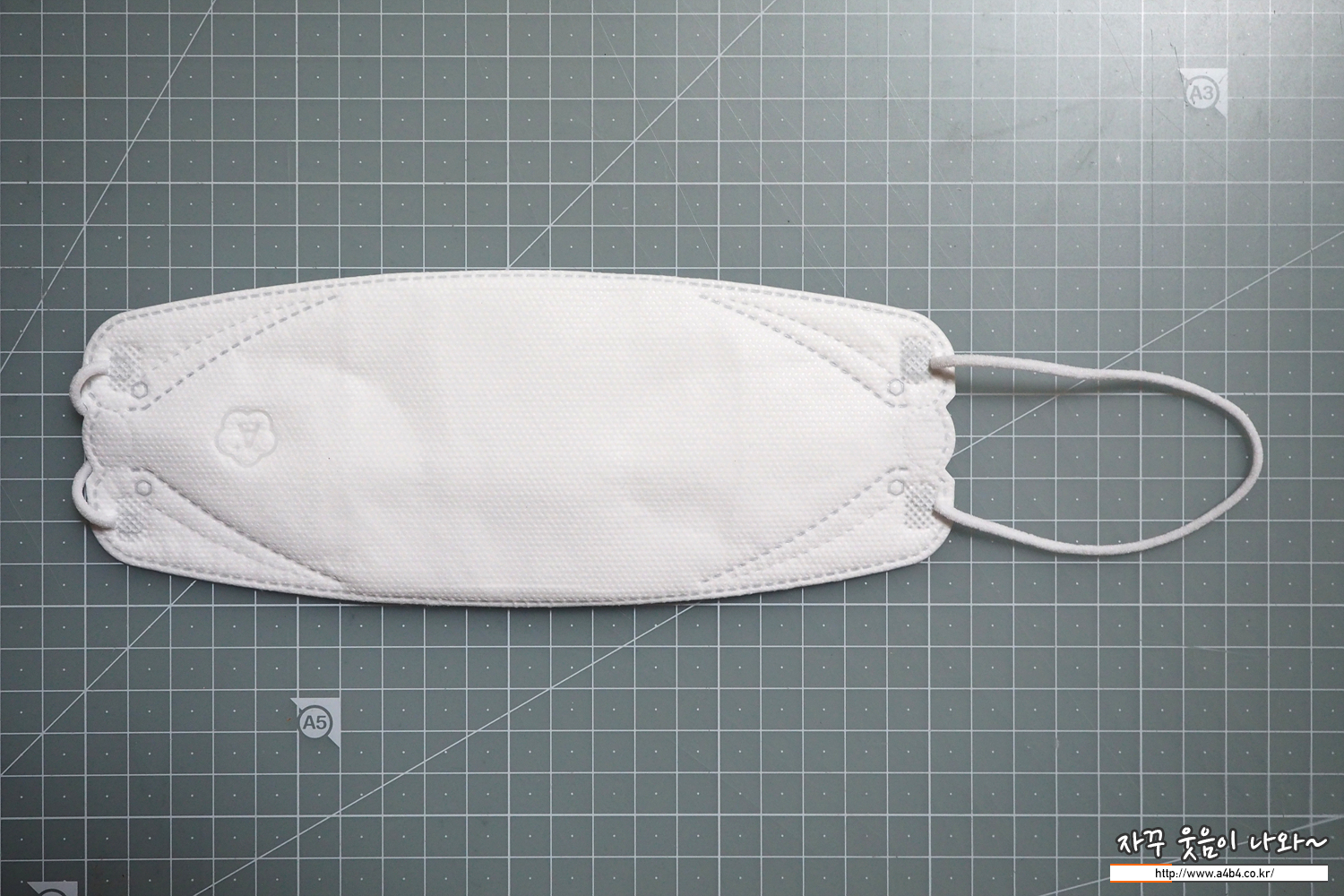 성상 본체 우측에 문양이 있는(A+) 흰색의 3단 가로접이식 본체에 코편이 있고, 양 측면에 흰색의 끈이 있는 부직포 마스크