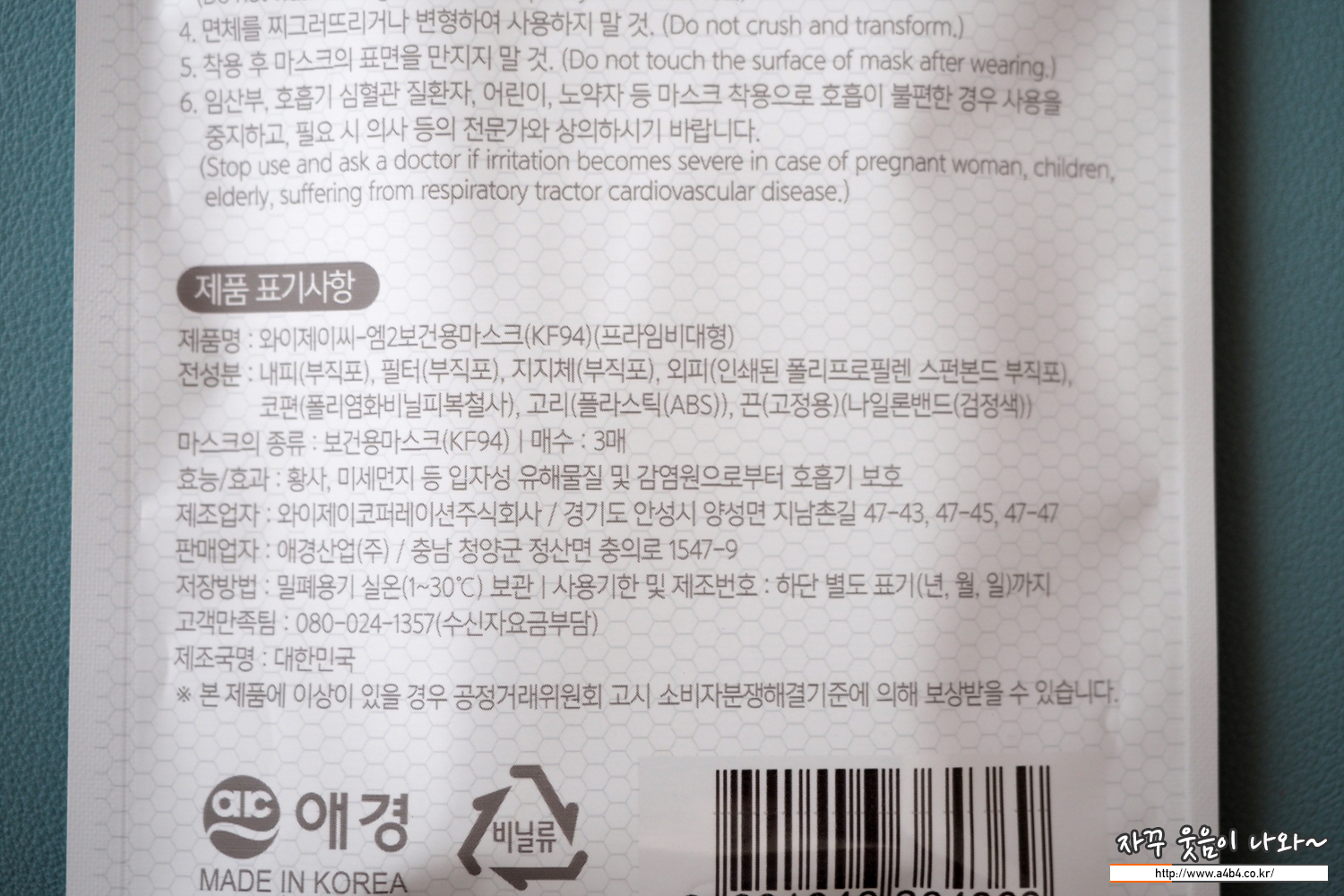앞에서 말한것과 같이 애경 랩신 마스크는 와이제이코퍼레이션에서 생산/판매하는 '와이제이씨-엠2보건용마스크'와 동일한 제품입니다. 두 제품을 번갈아 사용한 결과 착용감이나 착용핏에서 차이점을 느끼지 못했습니다.