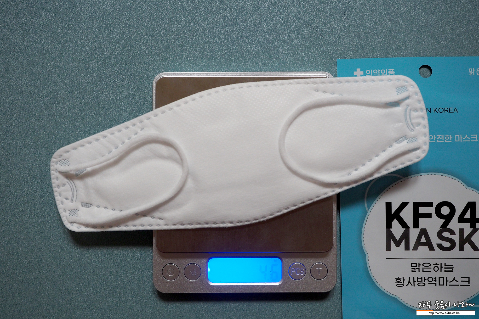 맑은하늘 황사마스크 KF94 대형 무게는 4.6g으로 타사의 대형 마스크와 비슷한 무게를 보여줍니다.