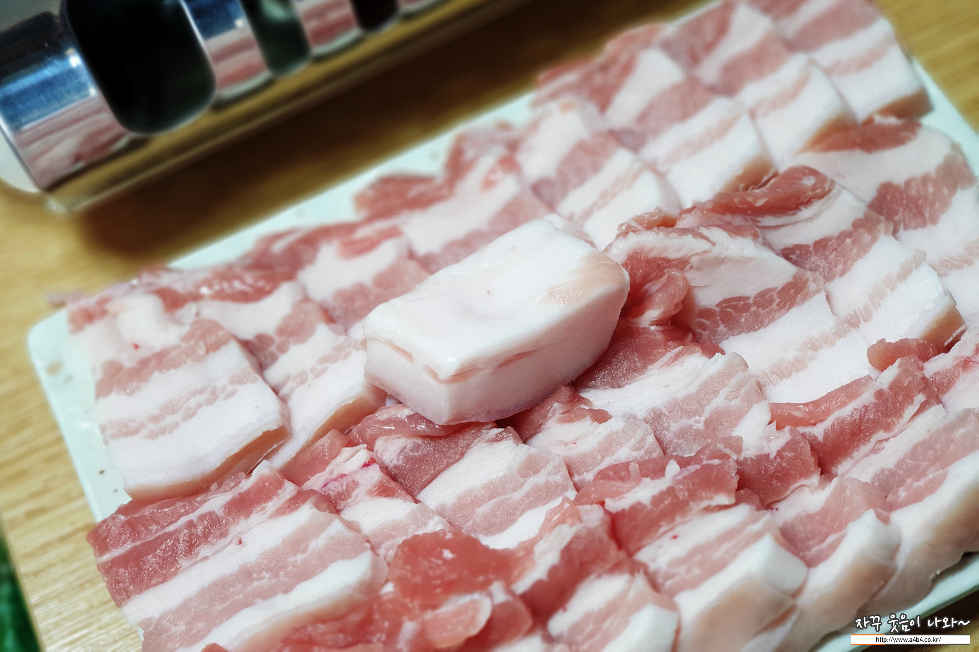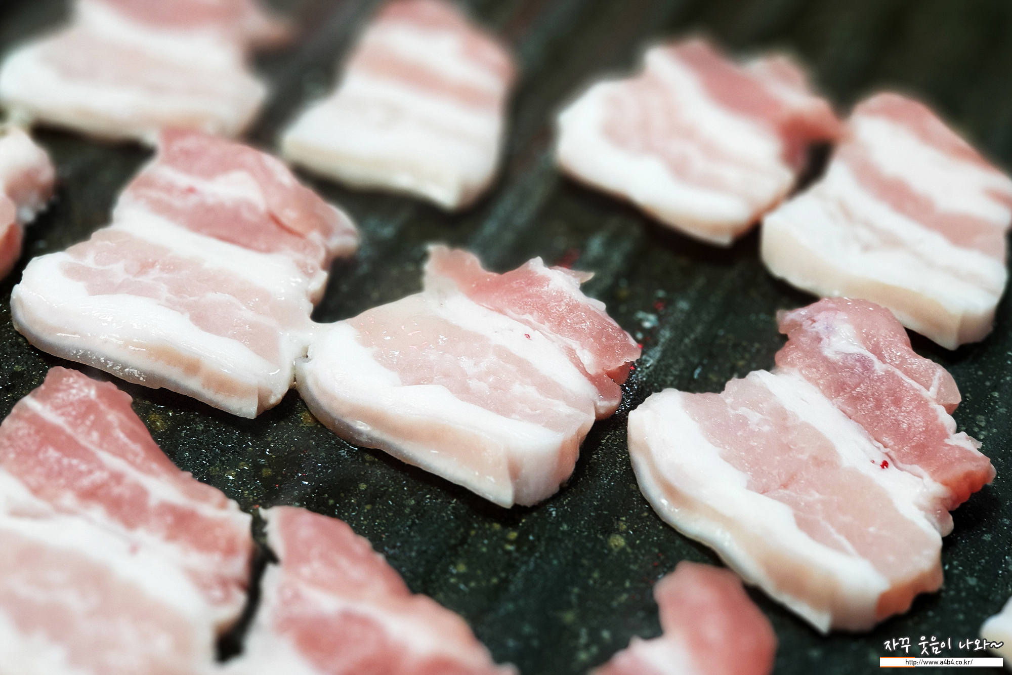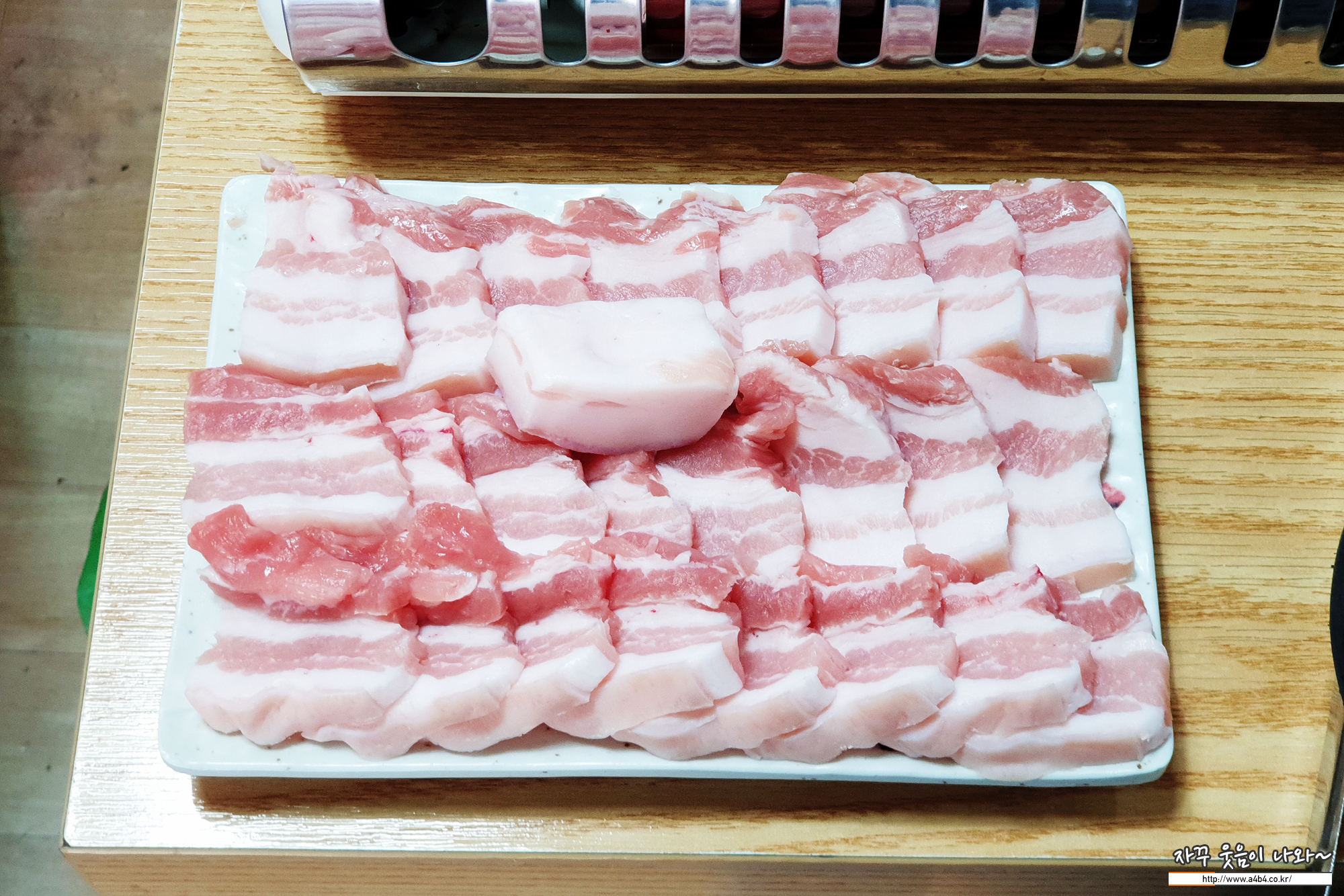 불판위에 돼지고기 비계로 길 좀 내고 삼겹살을 올립니다. 한 번에 딱 1인분 올리기에...