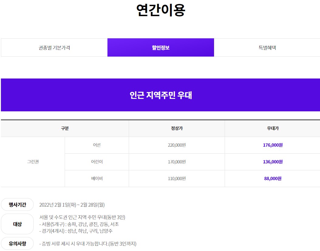 일년에 서너번만 와도 1회 자유이용권 보다는 연간이용권이 더 저렴하네요.