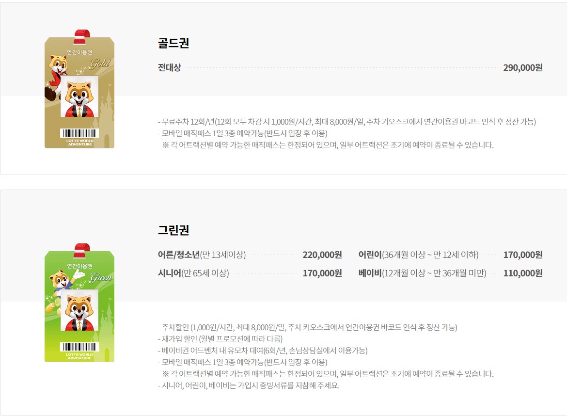 롯데월드 연간회원권은 그린권과 골드권으로 구분되어 있습니다. 과거에는 다른 종류도 있었지만, 이제는 골드와 그린 두 타입으로 판매하고 있습니다. 정가는 골드권이 290,000원, 그린권이 220,000원입니다. 사실 놀이기구 이용과 모바일매직패스, 입장등에 차이점은 없습니다. 차이점은 바로 주차요금에 있는데요. 골드권은 연간 12회 무료주차, 그린권은 롯데월드 무료주차 없이 주차요금 할인만 됩니다. 사실상 60,000원 가격차이를 고려하면 연간 8번 이상 방문해야 골드권이 의미 있다는...