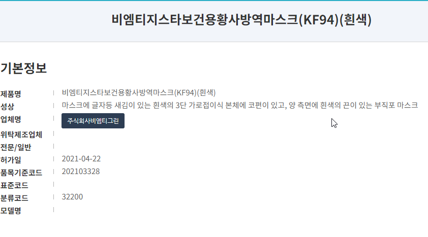 식약처에 등록된 제품명은 '비엠티지스타보건용황사방역마스크 (KF94)'입니다. 화이트 컬러와 대형 사이즈 제품이며, 작년인 21년 4월에 승인된 제품입니다. 마스크 제조사는 '주식회사 비엠티그린'으로 '비엠티지스타(BMT & GSTAR)' 브랜드로 여러 마스크를 유통하고 있습니다.
