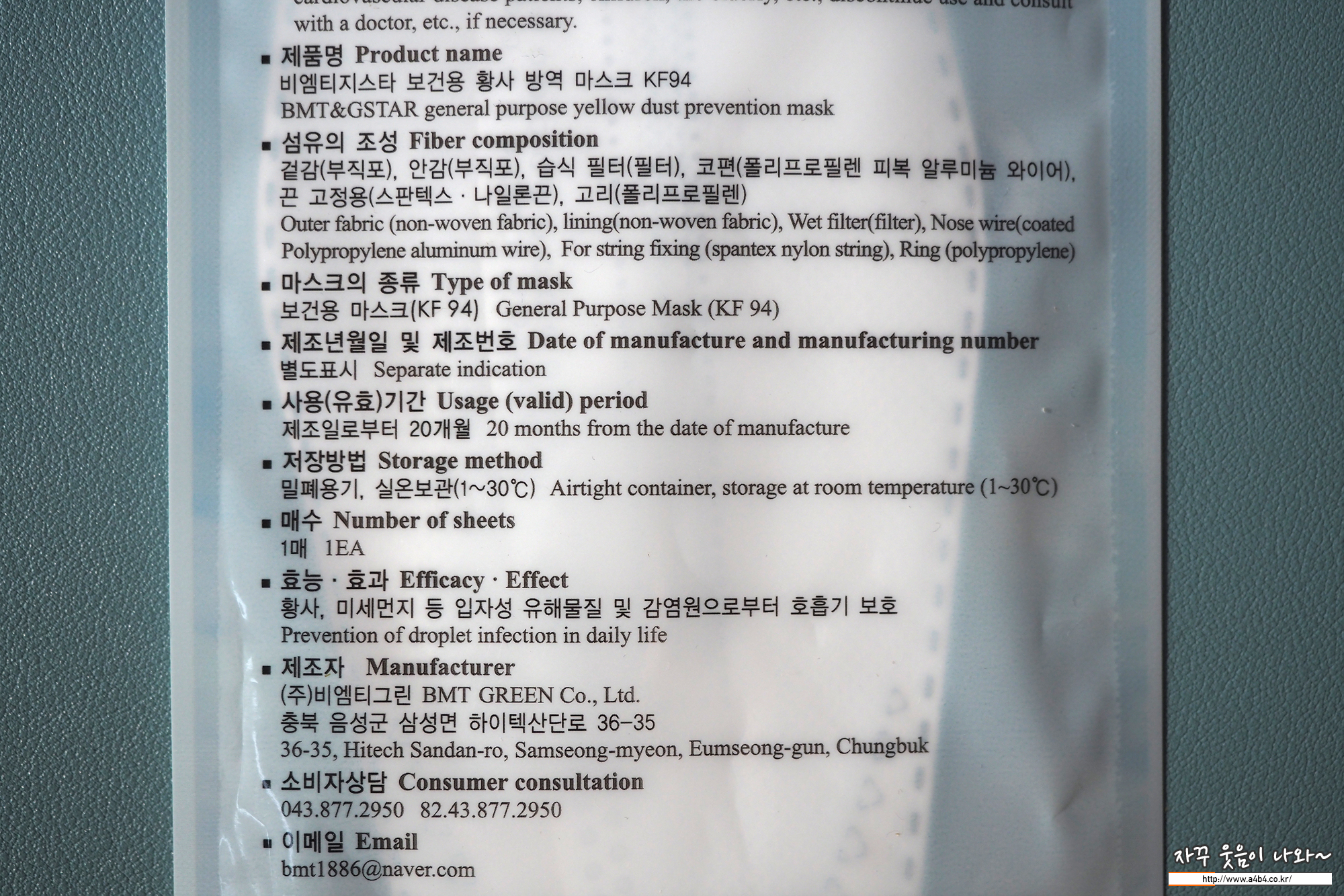 KF94 비엠티 지스타 마스크 무게는 4.5g으로 타사 제품과 비슷한 무게를 보여주고 있습니다.