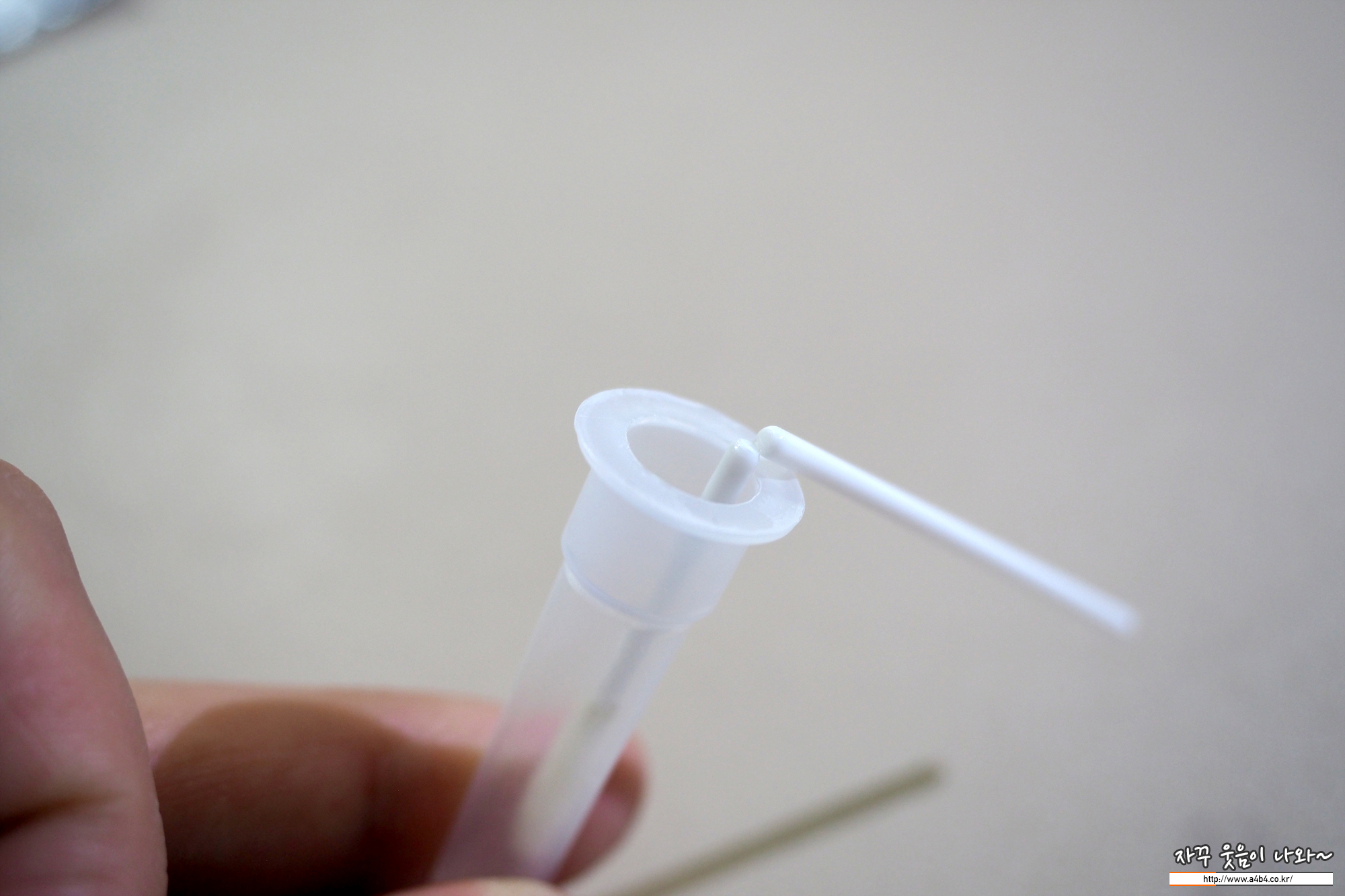 면봉은 검체 희석액에 넣고 10회 정도 흔드는 부분까지는 동일하지만, 타사 제품은 면봉을 짜내고 제거하는 방법과 다르게 래피젠 자가진단키트의 경우에는 면봉을 분질러서 희석액 통에 넣는 방식입니다.