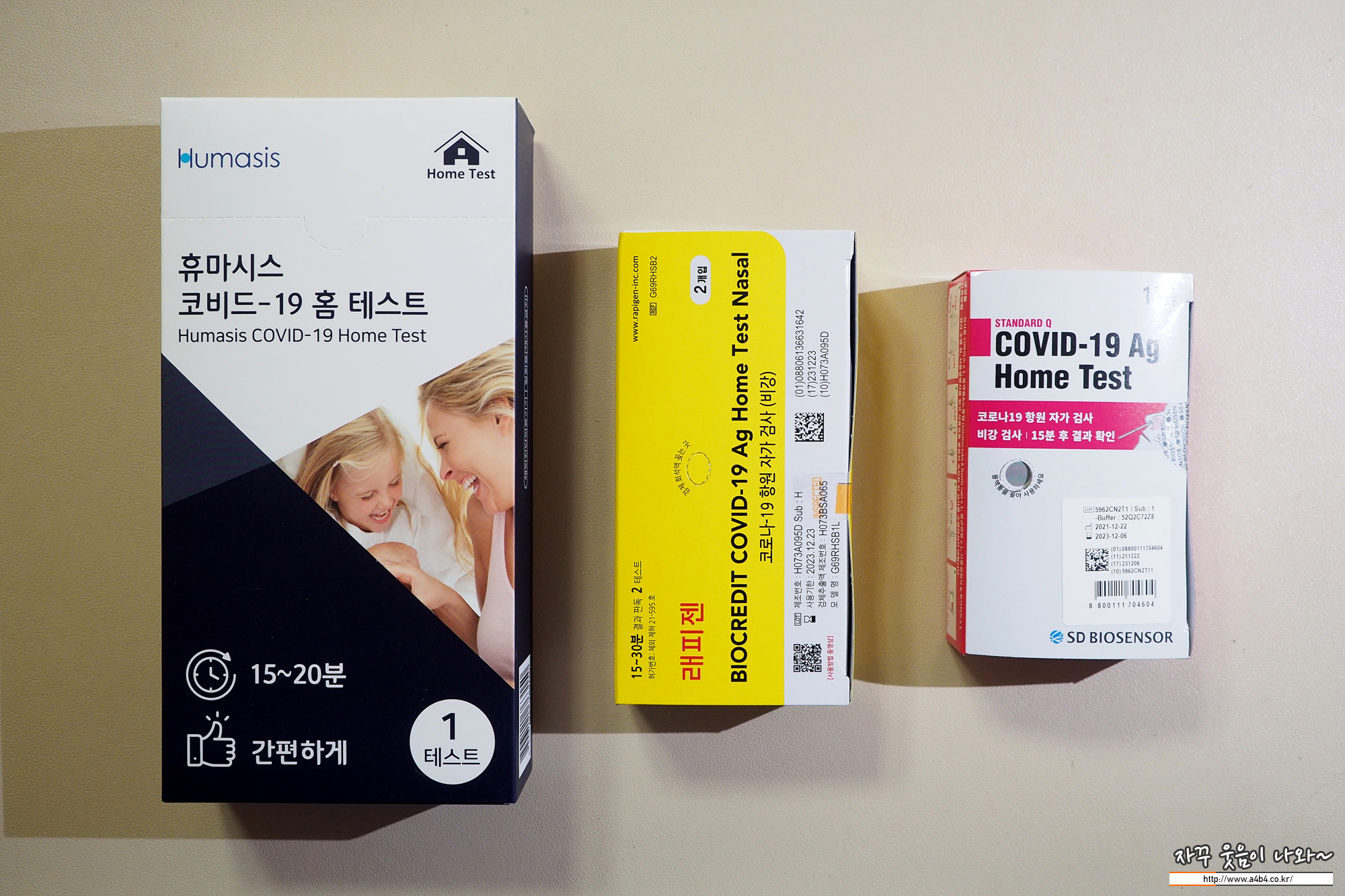 왼쪽부터 휴마시스 1회용 > 래피젠 2회용 > SD바이오센서 1회용 순서입니다.