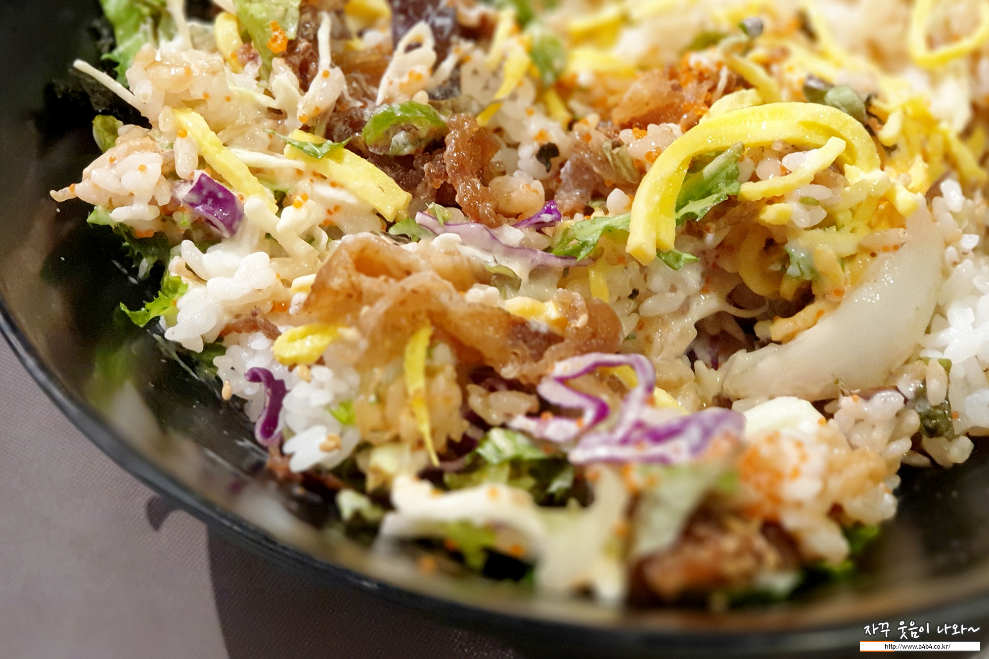 불고기와 양파등의 야채, 마요네즈와 알이 들어간 퓨전알밥입니다.