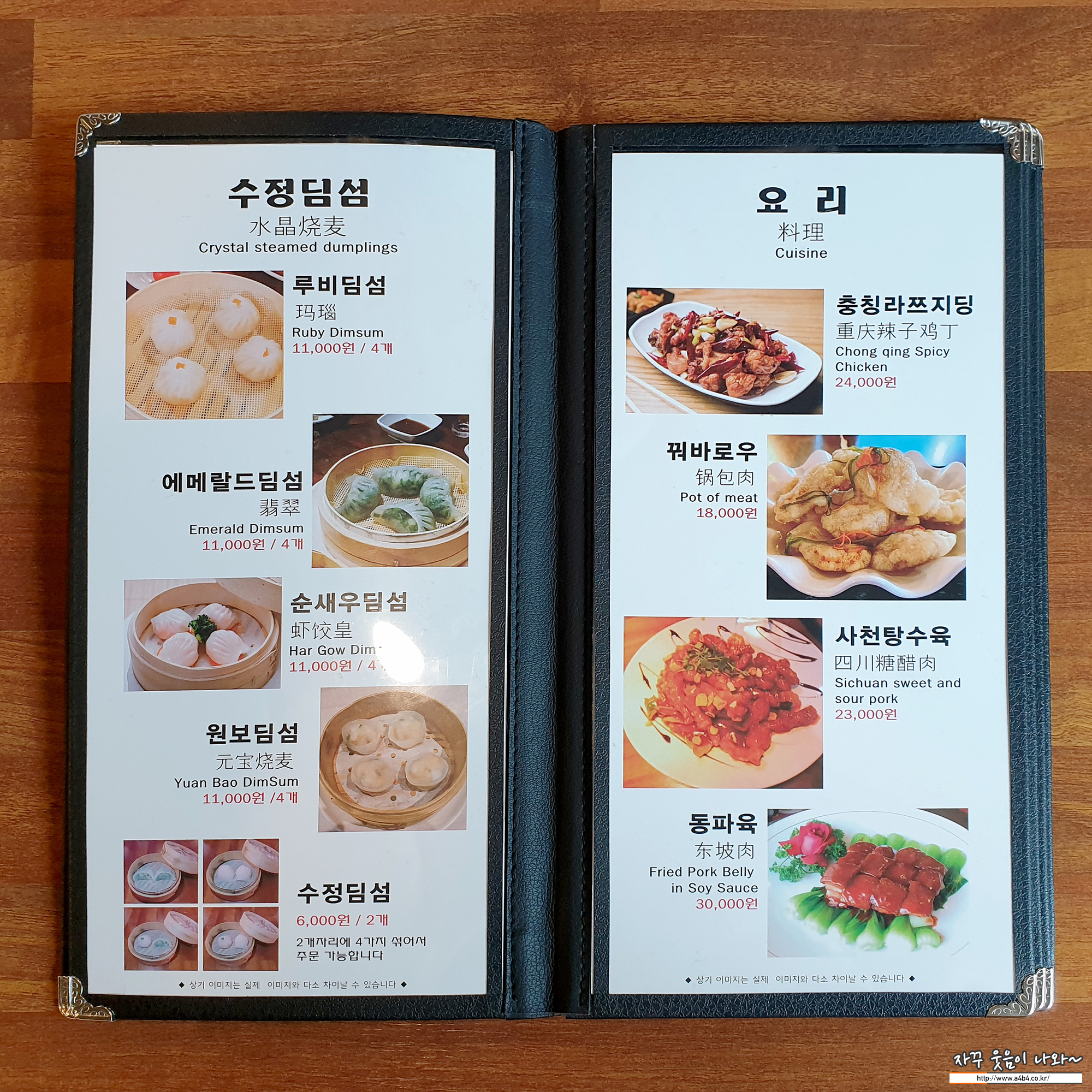 메뉴는 수제딤섬과 만두, 꿔바로우 탕수육, 새우 등 요리, 면류, 라이스류와 주류가 준비되어 있습니다.