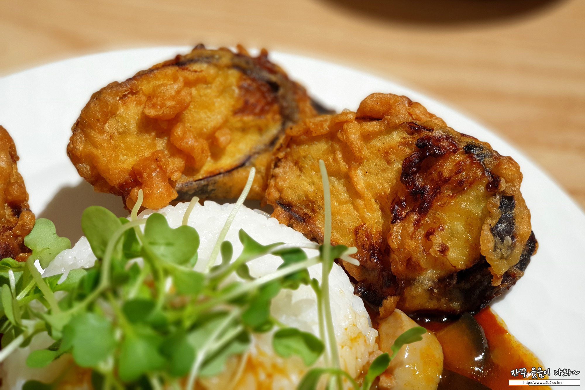 큼직하게 3덩어리 가지 튀김이 나오는데요. 단순히 가지 튀김이 아닌 가지 안쪽에 만두소 비슷하게 고기소가 들어 있습니다. 크기도 큼직해서 3개 다 먹으면 배가 통통...