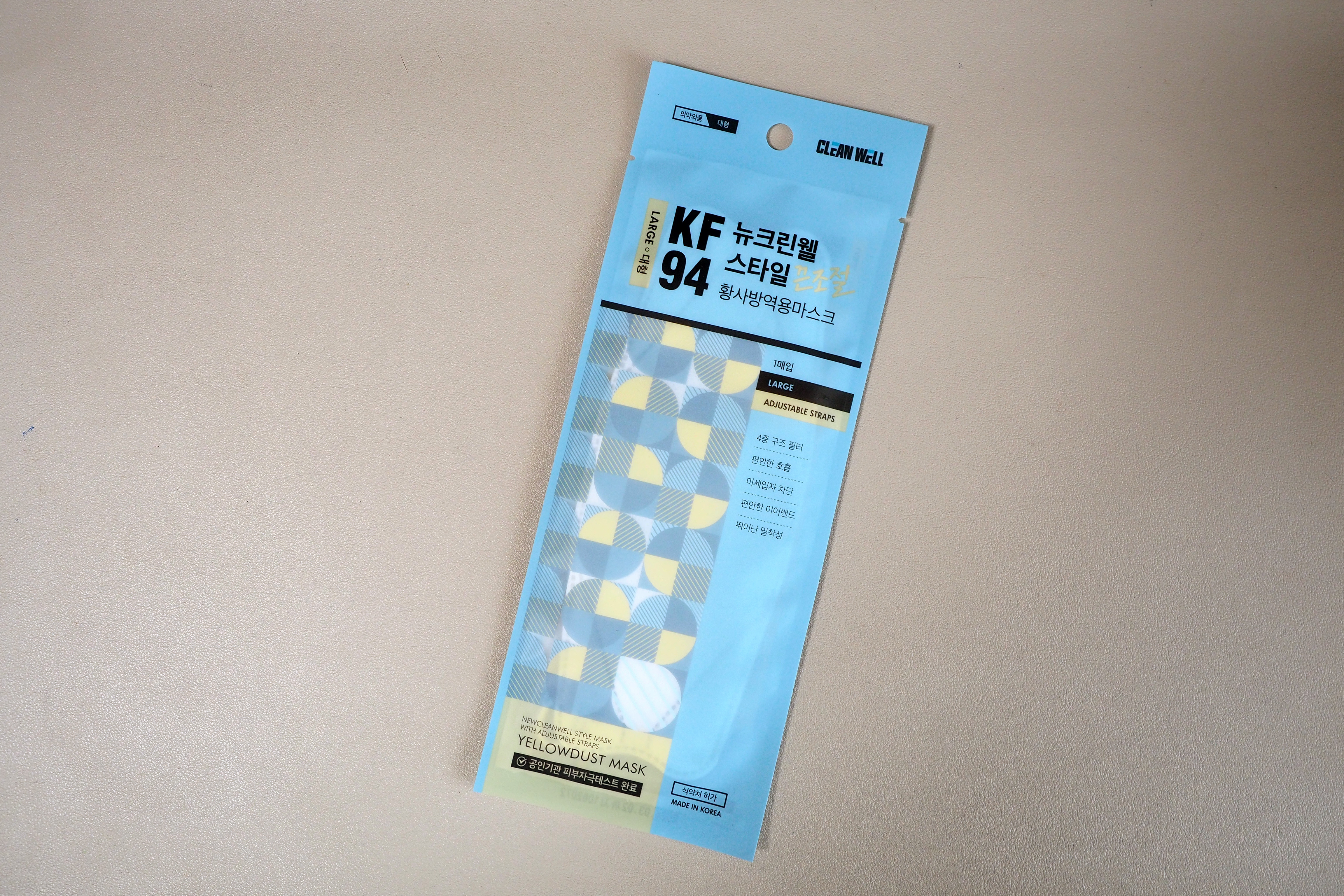 이번에 식약처 불량마스크로 등록(적발인지 자진 신고인지는 확인하지 못했네요)된 뉴크린웰 마스크는 사진과 같이 가로 삼단접이식 마스크에 끈조절이 가능한 끈조절 클립이 부착된 독특한 타입의 마스크입니다.