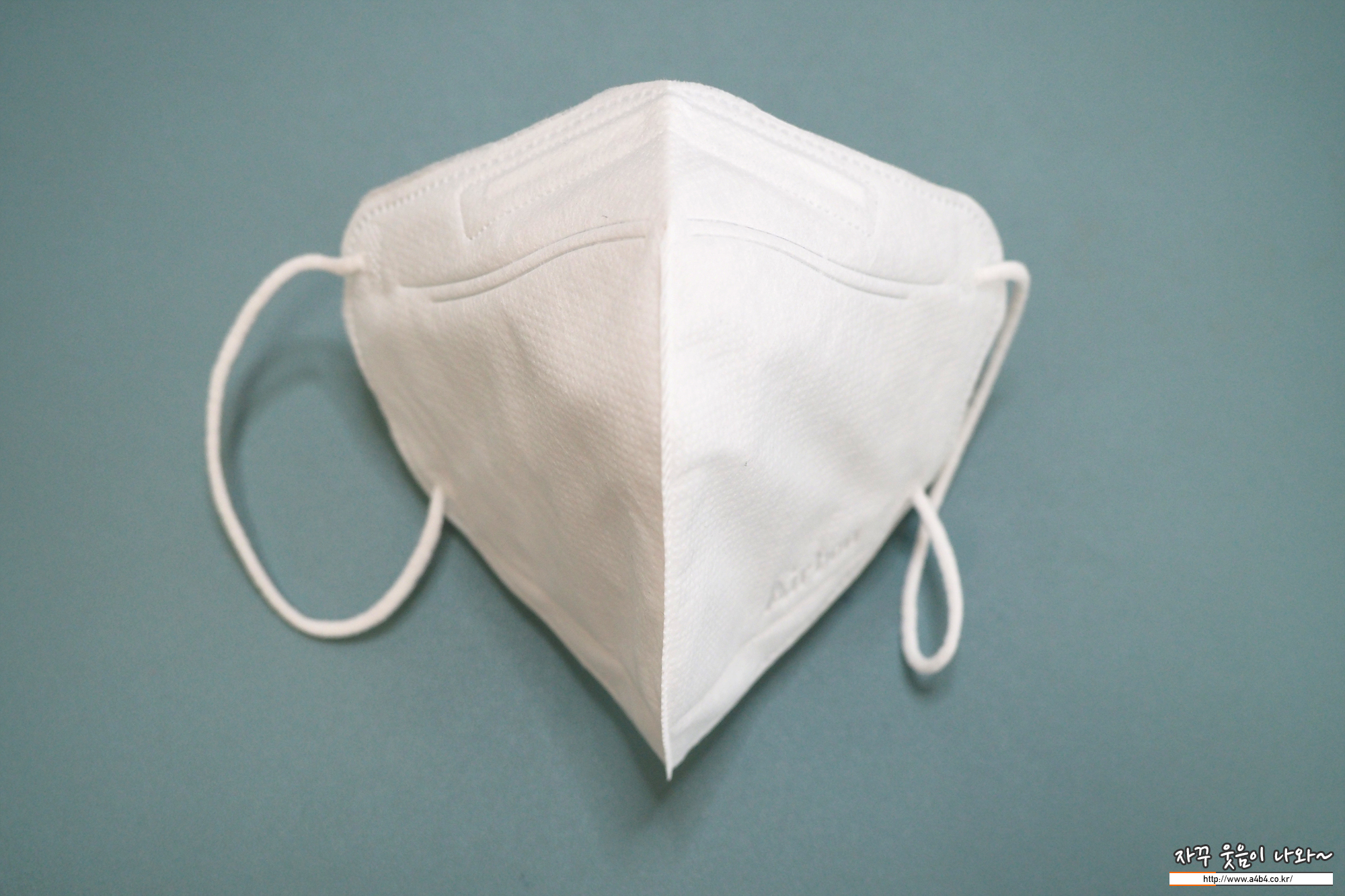 에어본 마스크 디자인은 일반적인 가로 이단접이 새부리타입 마스크 디자인을 보여줍니다. 마스크 전면에는 제품명인 에어본이 영문 Airbone로 각인되어 있습니다. 외형은 일반적인 새부리타입 보건용마스크와 비슷합니다.