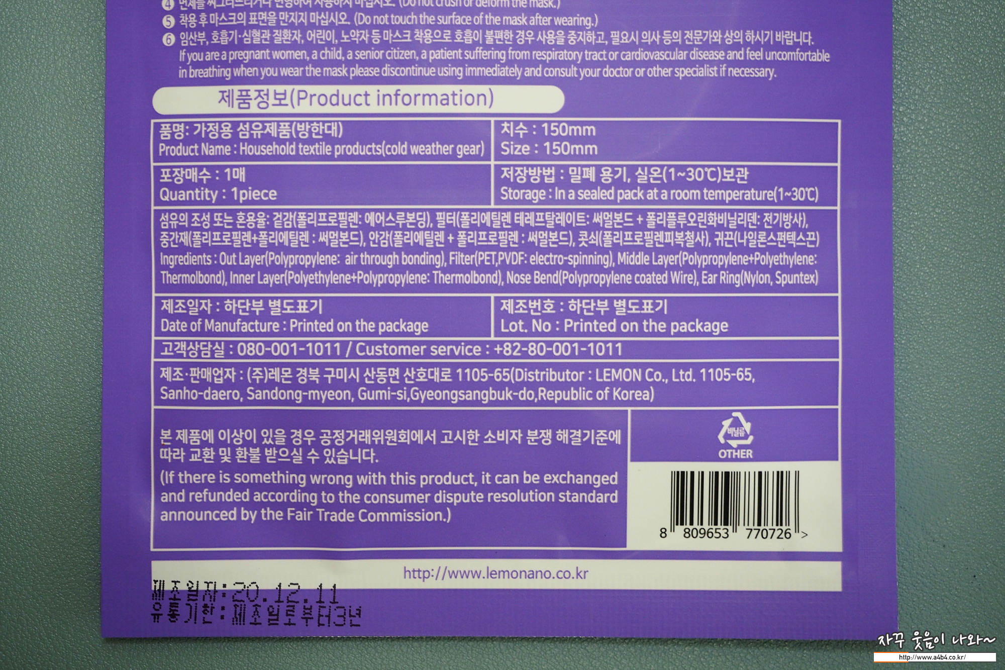에어본 마스크는 보건용마스크가 아닌 일반 가정용 섬유제품으로 등록된 제품입니다. 마스크 제조원은 나노파이버섬유 생산업체로 알려진 주식회사 레몬입니다.