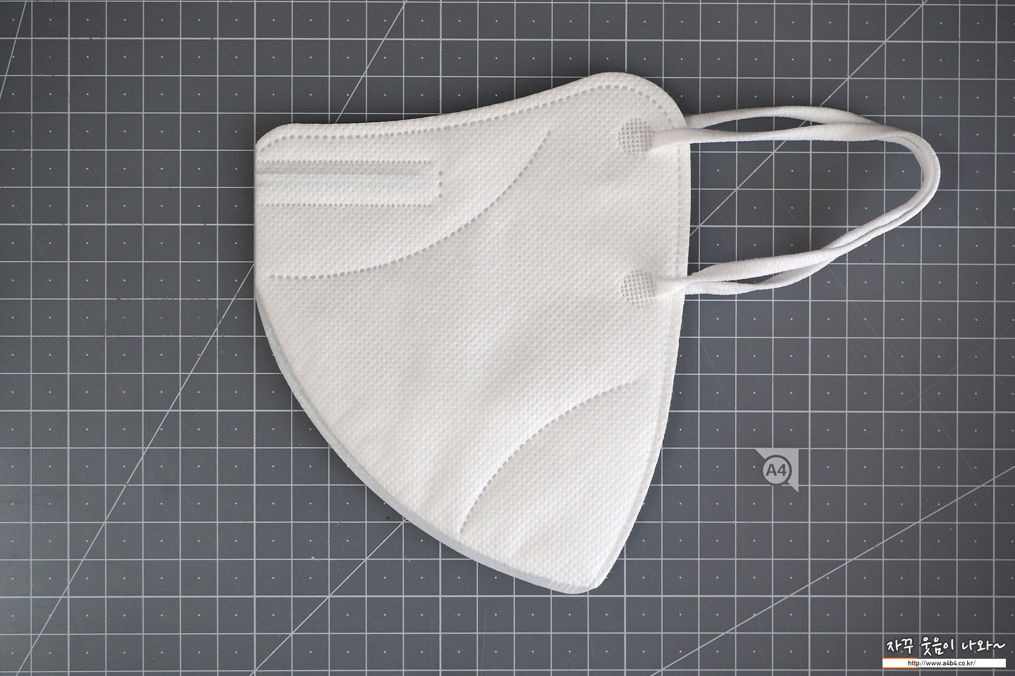마스크 전면에는 납작한 타입의 칼국수끈이 귀걸이끈으로 사용되었습니다.