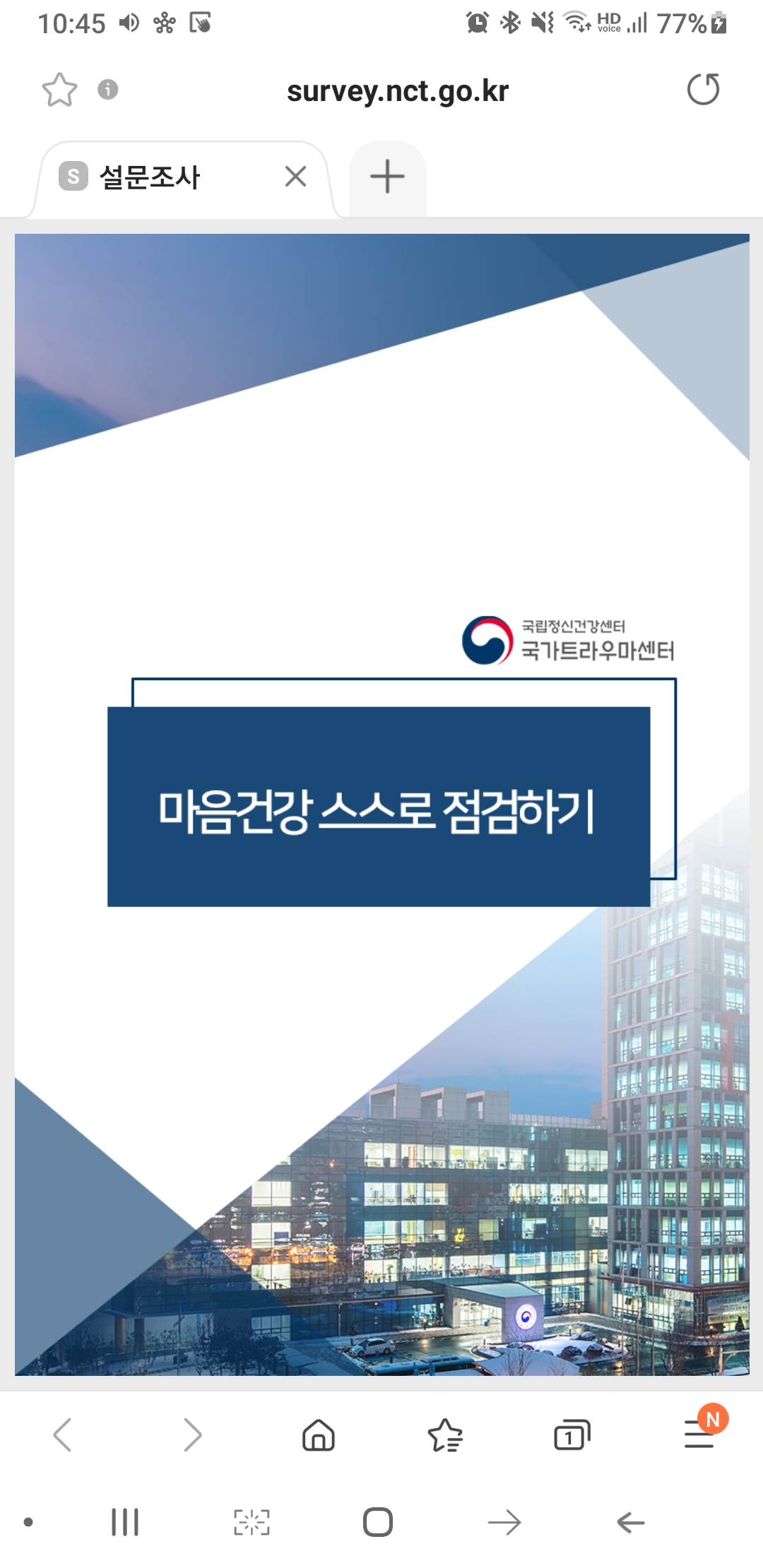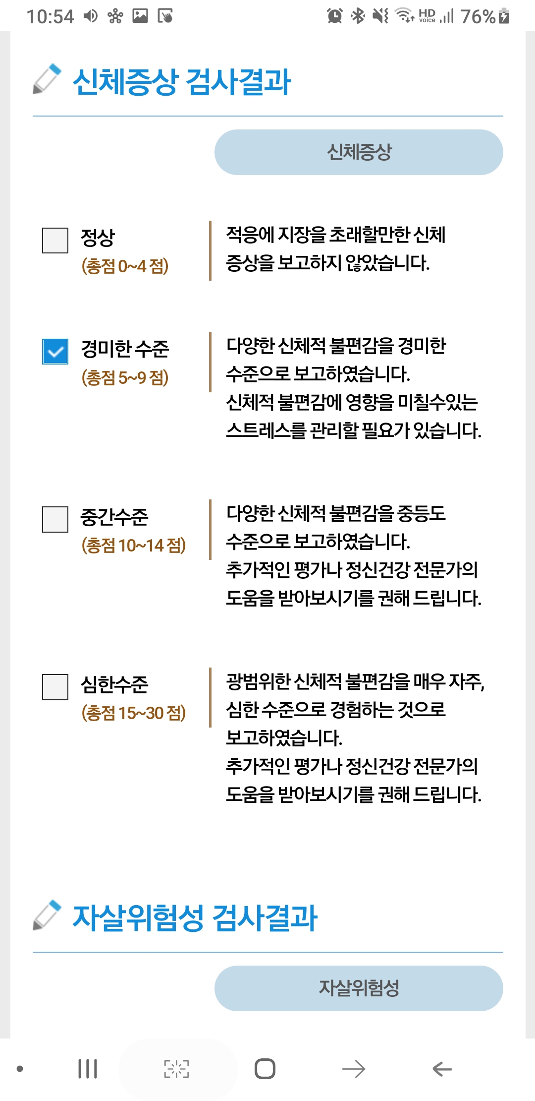 스마트폰에서 자가진단 후 결과도 볼 수 있다. 스트레스 지수, 자살지두 등등...