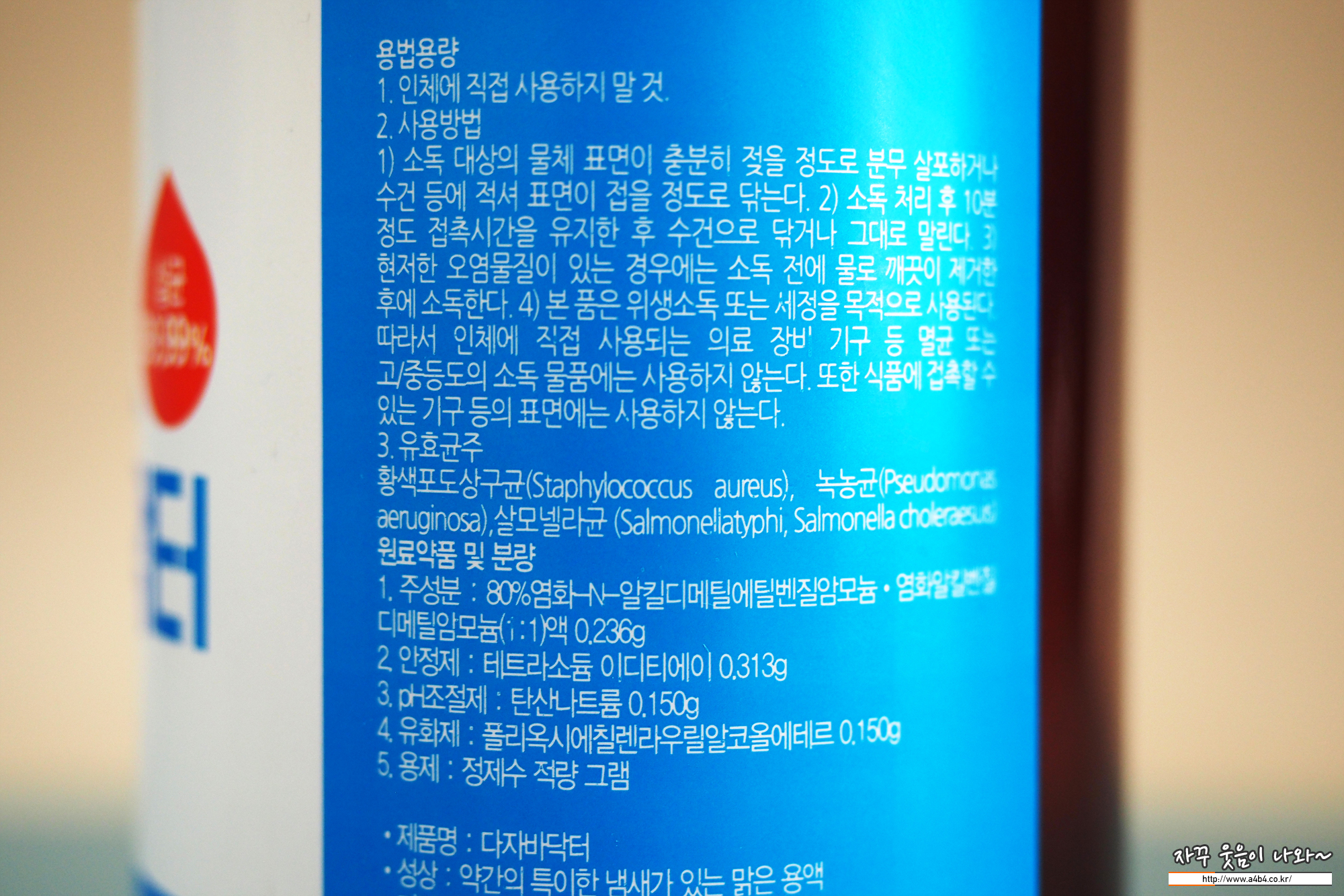 '다자바닥터 스프레이 다용도살균소독제'는 몇달전에 딸아이가 밀접접촉자로 자가격리 되면서 사용하다 남은 제품이다. '염화-n-알킬디메틸에틸벤질암모늄'과 '염화알킬벤질디메틸암모늄' 1:1 혼합액으로 된 소독제인데 이 제품은 식품에 접촉할 수 있는 기구·용기 등의 표면에 사용이 금지된 제품이다. 집에서는 화장실 같은곳에 사용하는...