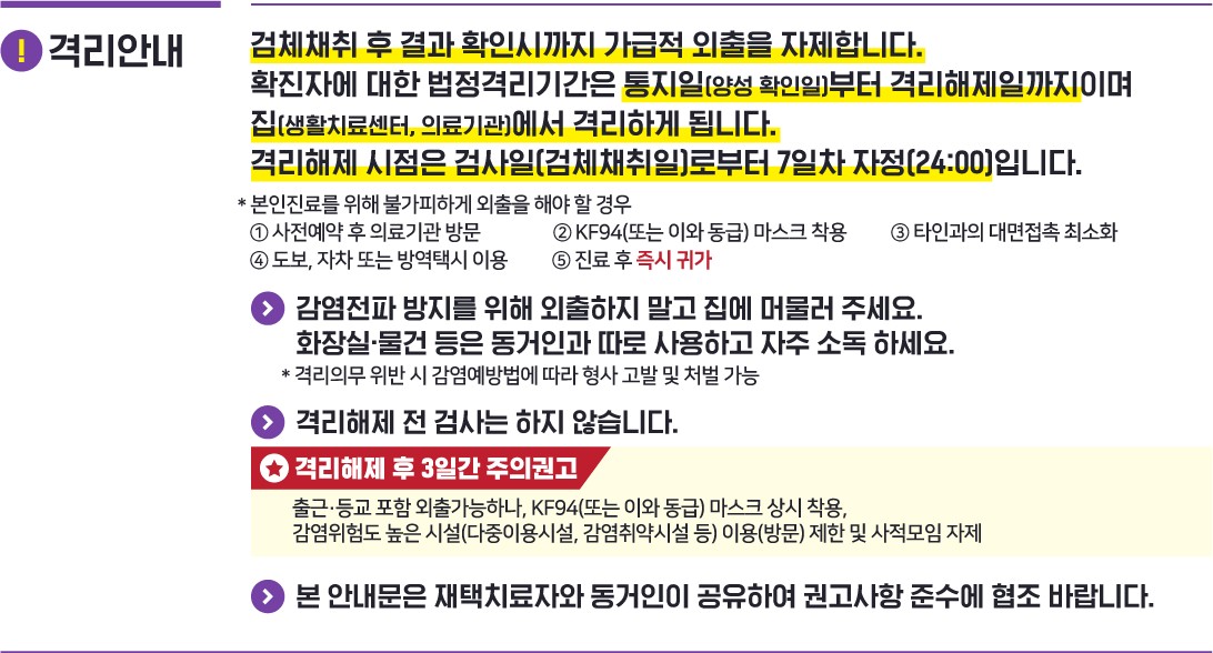 | 코로나 확진자 격리기간은 검사일로 부터 7일 자정까지