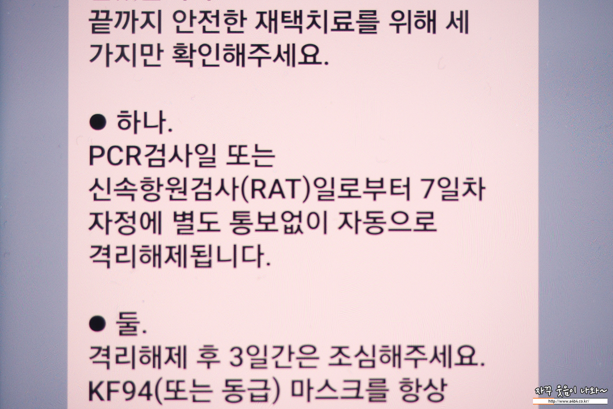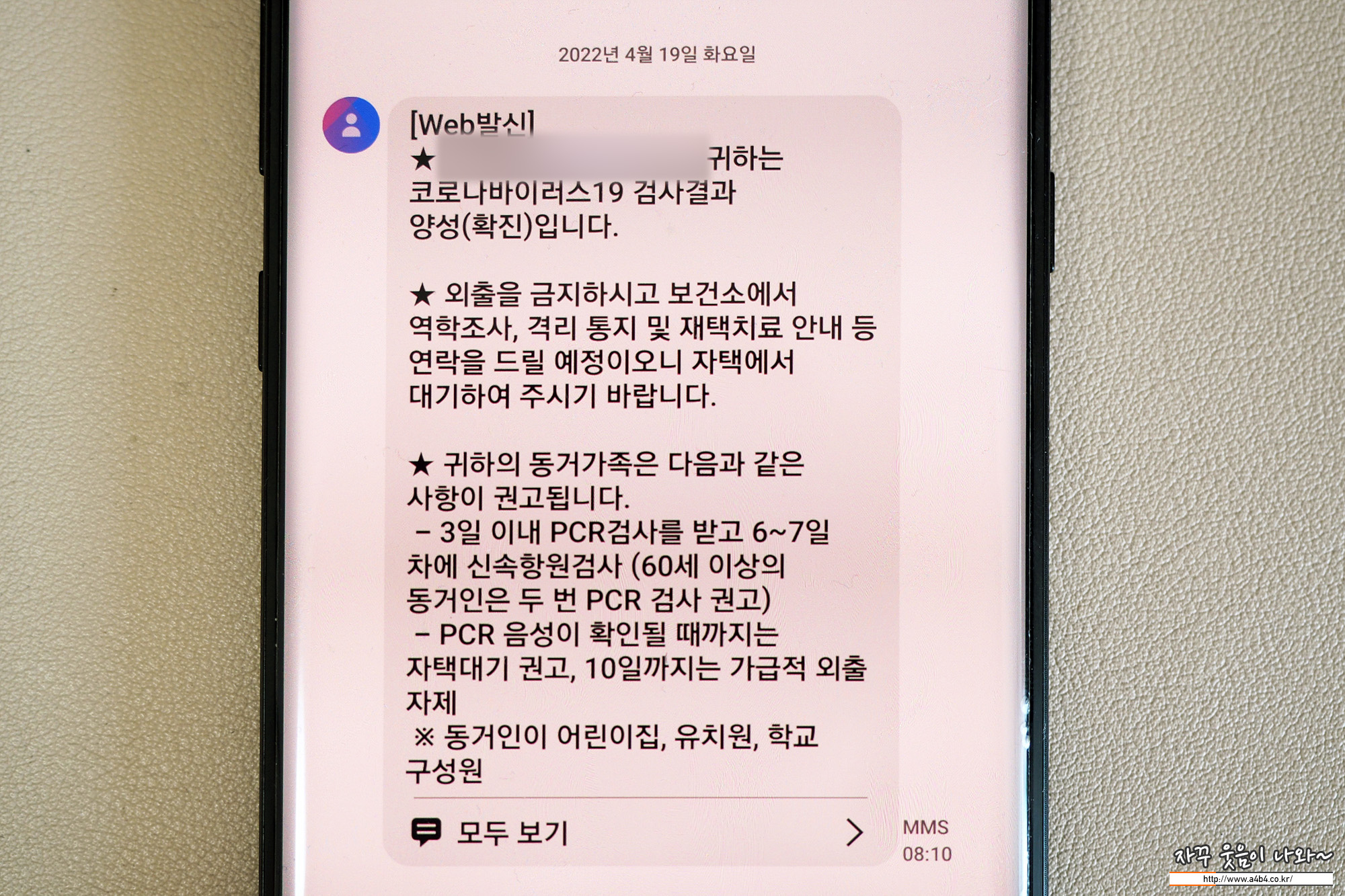 저는 ① 17일 일요일에 집에서 코로나 자가진단키트로 양성, ② 다음날 18일 월요일 보건소 PCR검사 ③ 19일 화요일 코로나19 확진판정을 받았습니다.