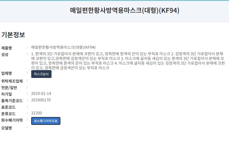 식품의약품안전처에 등록된 제품명칭은 '매일편한황사방역용마스크 (Kf94)'입니다. 사이즈는 대형으로 마스크 제조사는 '마스크상사'입니다. 2019년 1월에 허가된 제품으로 과거 불량마스크로 적발된 이력이 있는 제품입니다.